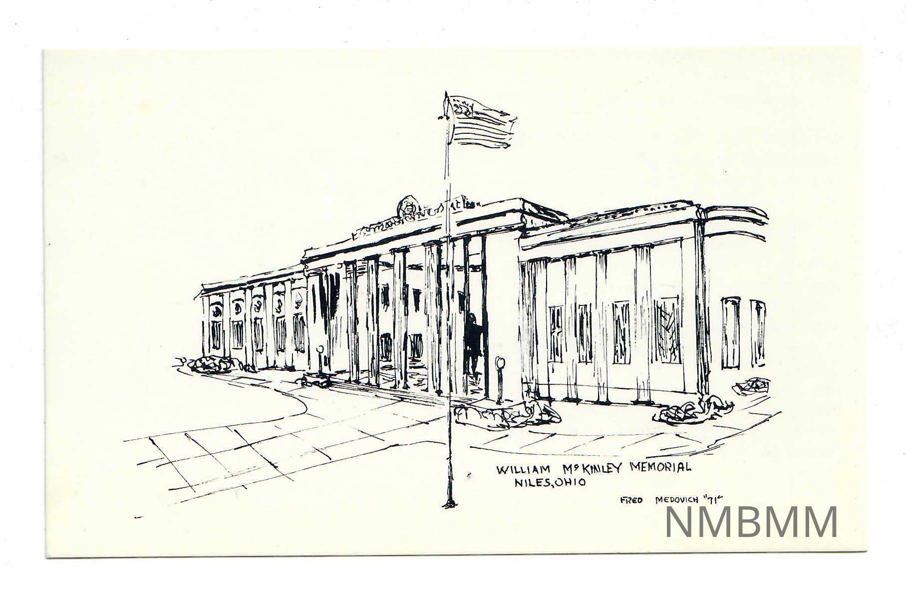 Four copies of postcards showing a sketch by Fred Medovich, artist and art teacher in the Niles City Schools, of the front of the National McKinley Birthplace Memorial. The perspective is from the front corner closest to the auditorium. The back of the card has the following text on the left side: "This side for correspondence WILLIAM MCKINLEY MEMORIAL Corner Stone Laid November 20, 1915. Honoring President William McKinley, 25th Preident of the United States. He was born in Niles, Ohio, January 29th, 1843, Assassinated September 6th, 1901. The building is constructed of Georgian marble. It is 232 feet long, 136 feet wide, and 38 feet in height. The Court of Honor is supported by 28 monolithic columns. One wing of the Memorial houses a library. The other wing has a large assembly room, with the McKinley Museum on the second level." The right side of the card is divided from the left by a double solid black line with the label of the International Printing Trades Council (that reads "Allied Printing Trades Council Waukegan, Ill. Union Label") with "2" next to it. To the right of this are the words "Post Card This side for Address" and a small printed square in the upper right corner of the card with the text "place Stamp Here" printed in the square. All printing is in black.