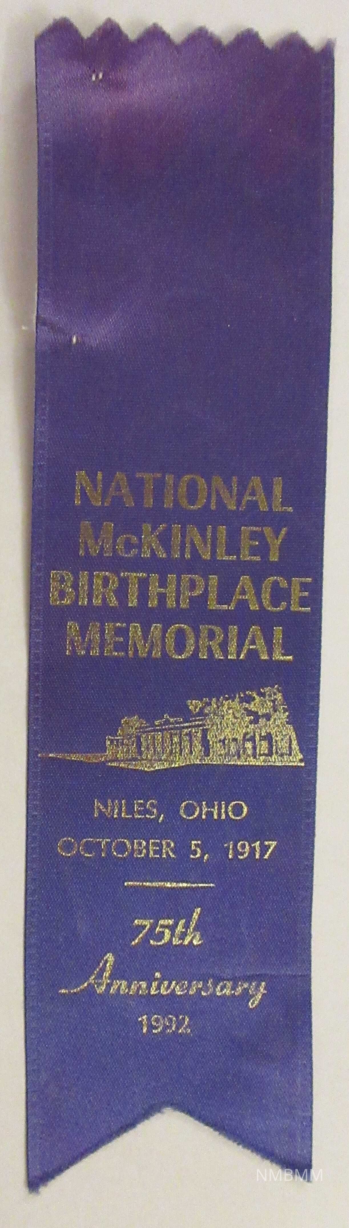 Faded blue satin ribbon with inverted v cut at bottom. The silkscreened lettering is placed about midway down the front and reads "National McKinley Birthplace Memorial" with a picture of the Memorial beneath it. Under the picture is the text "Niles, October 5, 1917 75th Anniversary 1992." The back is plain.Collection