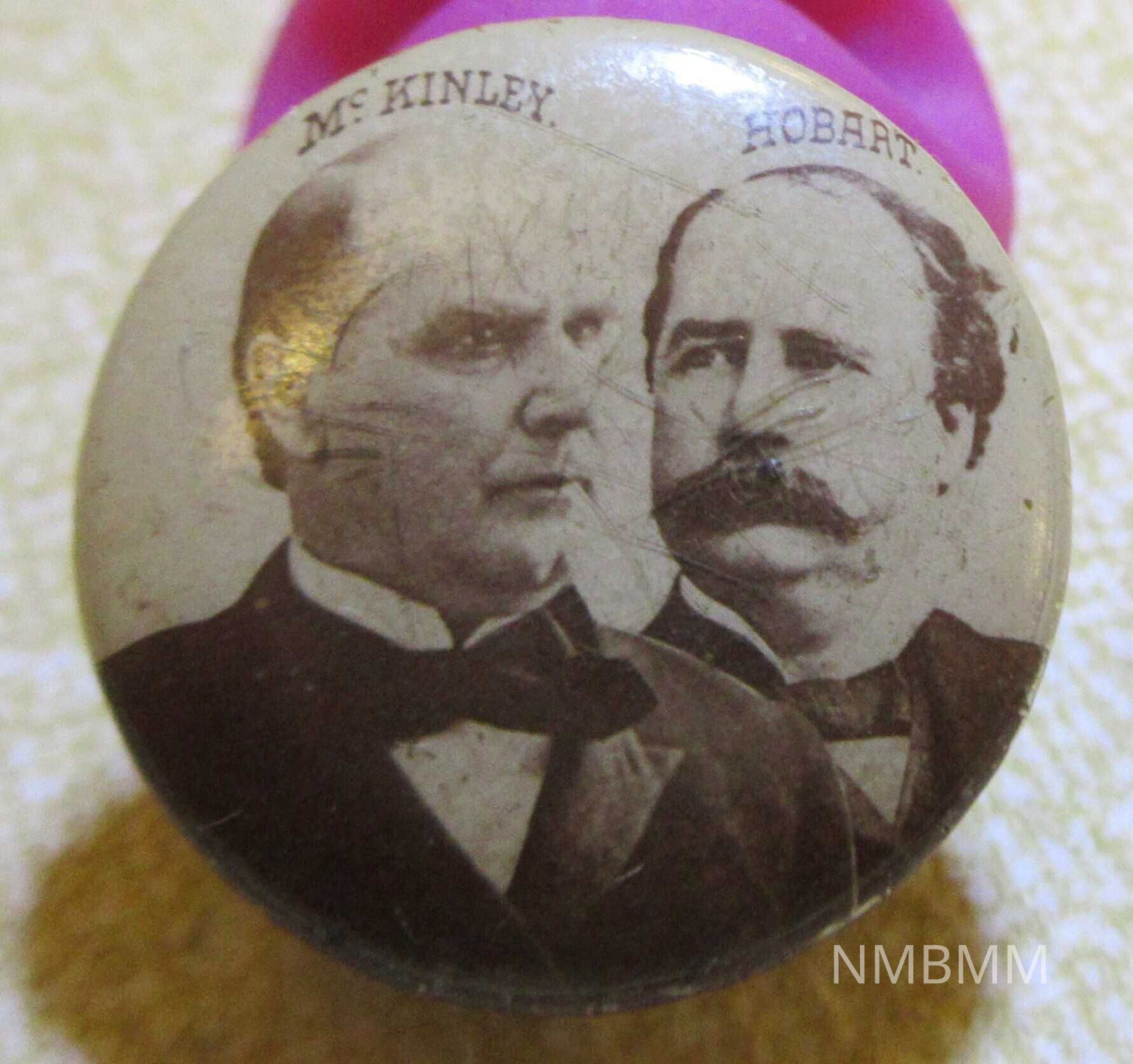 A small campaign stud used in the 1896 Presidential election, with sepia tone images of McKinley and Hobart, their names written above them. The back has a stud and was primarily worn on a lapel. 3/4" in diameter.Collection