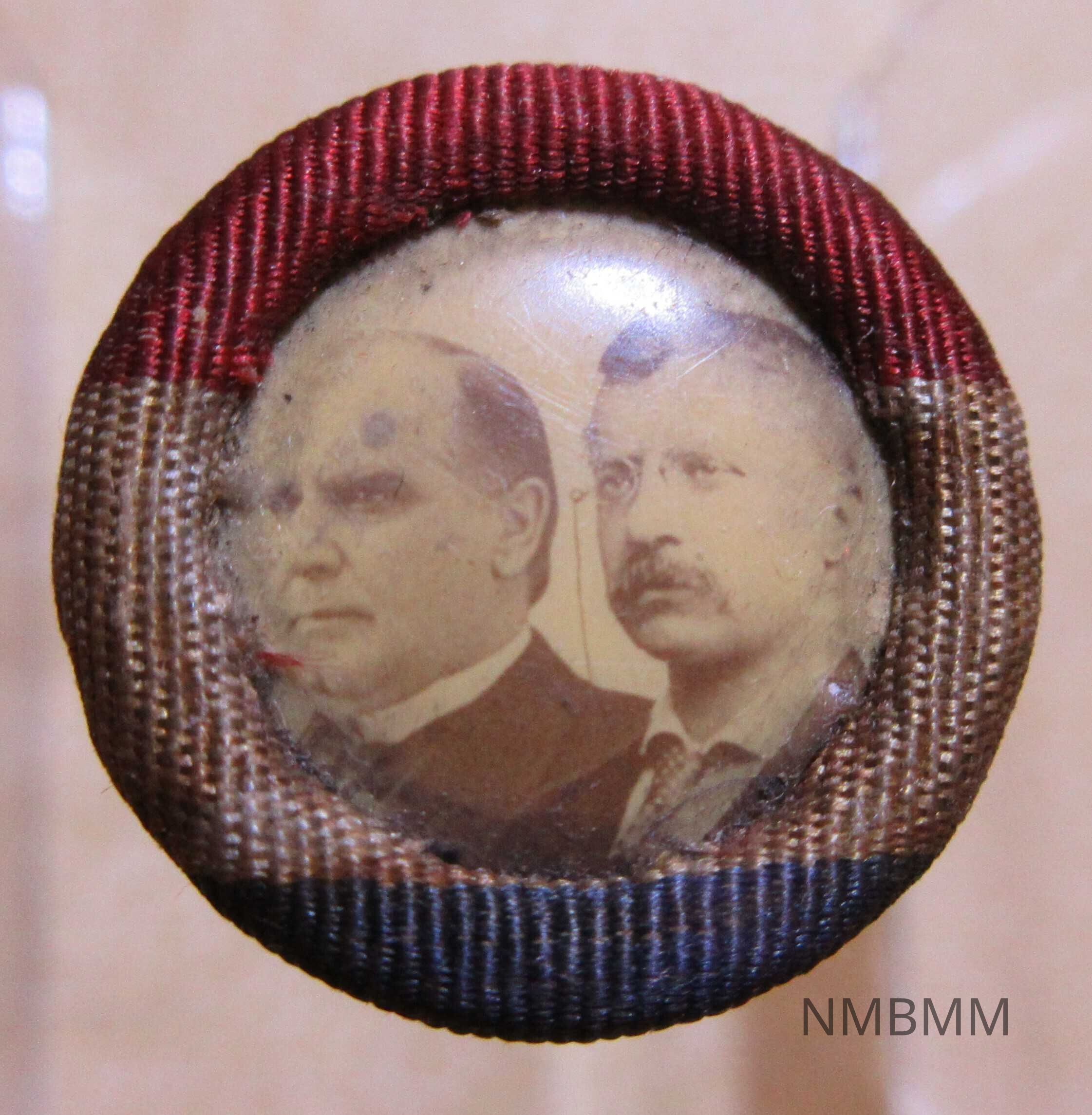 A small campaign stud used in the 1900 Presidential Election, featuring a black and white celluloid jugate of William McKinley and Theodore Roosevelt, facing left, with a red, white and blue cloth border . 3/4" in diameter.Collection