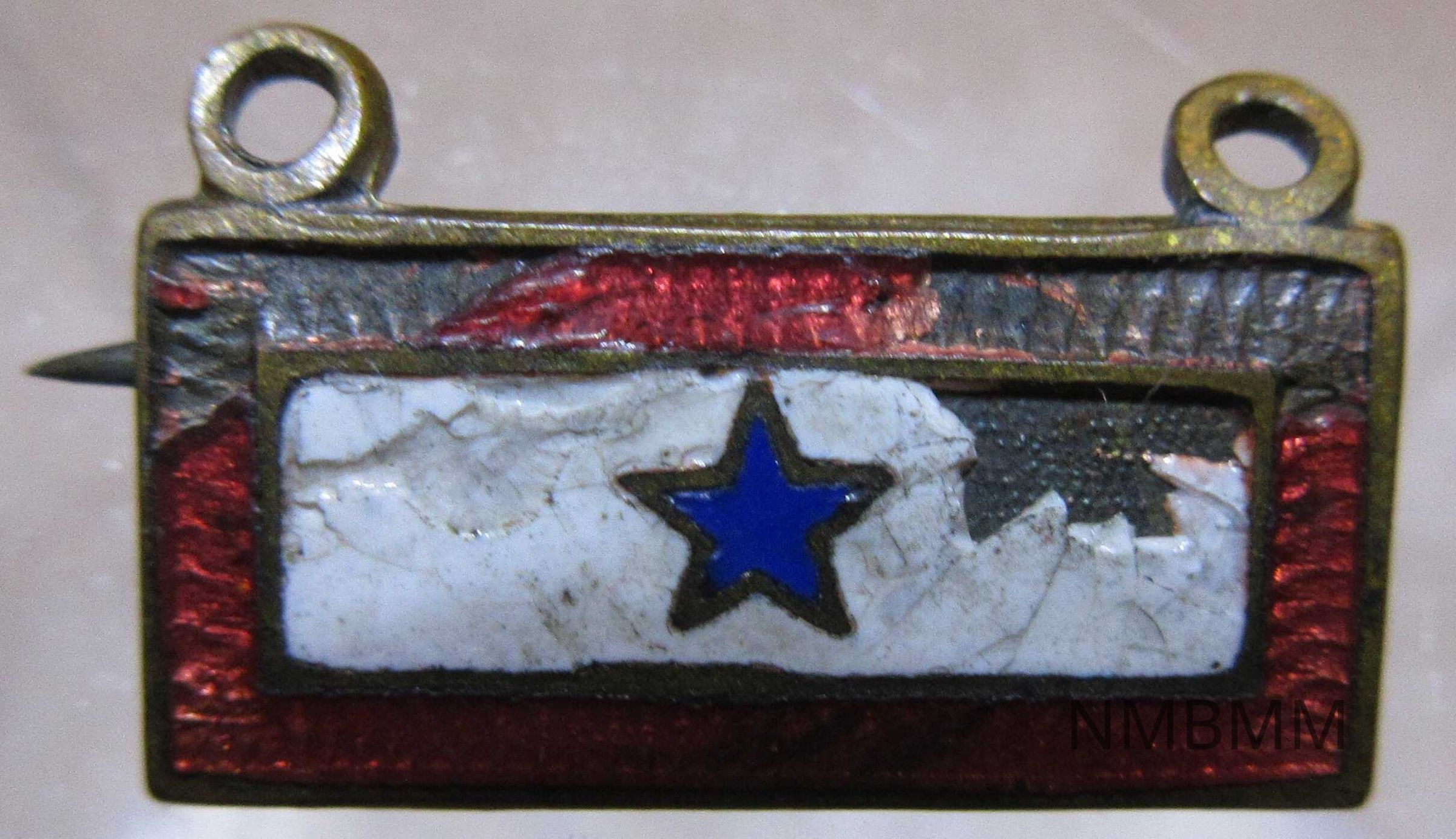 The item is a military pin belonging to James R. Graham. Graham enlisted in the U.S. Army on August 12, 1895 at the age of 25. He served in the army for 6 years before being honorably discharged on November 9, 1901. Graham arrived in Cuba on June 23, 1898 and stayed until August 12, 1898. The pin rectangular in shap, is bronze, and has a small blue star in the center of a white background and red perimeter. The reverse side has a pinback for attachment.
