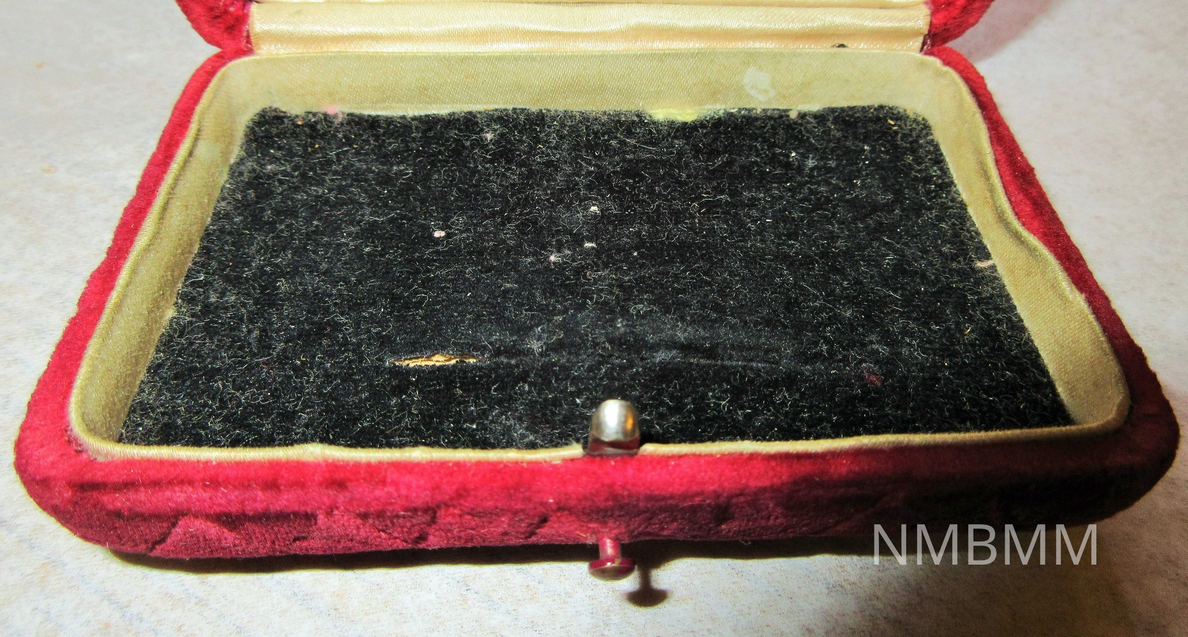 A small dark red velvet jewelry box in which items 2013.3.04a and 2013.3.04b were found. The letters "B.G." have been etched into the top of the box. The word "PERSONAL" has been etched into the front of the box.Collection