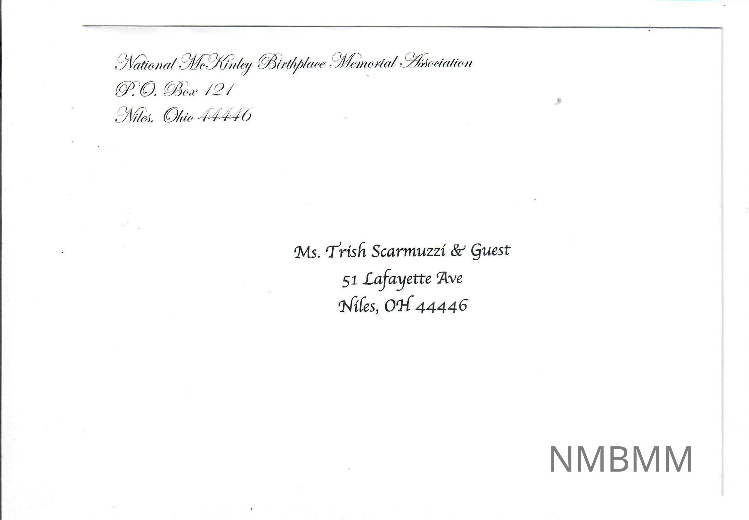 White A7 envelope (5.25 x 7.25 inches) used as the outer envelope for invitations sent for the National McKinley Memorial Centennial Gala. The return address is written in script and reads as follows: National McKinley Birthplace Memorial Association P.O. Box 121 Niless, Ohio 44446." The addressee is written in script on a clear sticker affixed to the front center of the envelope. The text reads as follows: "Trish Scarmuzzi 51 Lafayette Ave. Niles Ohio 44446." The back is plain and features a flap extending 2 inches from the top.Collection