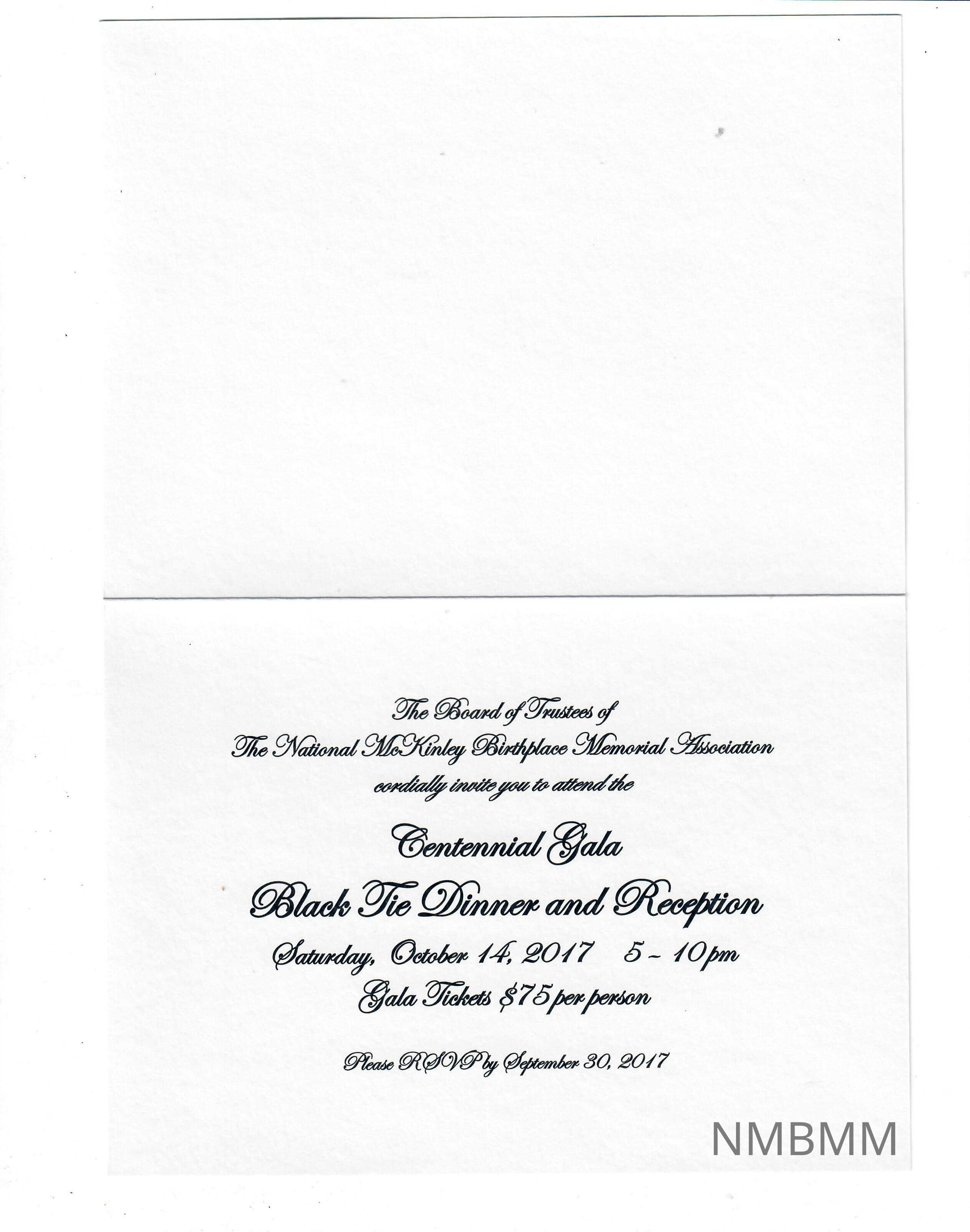 National McKinley Birthplace Memorial entennital Gala InvitationEntry/Object ID