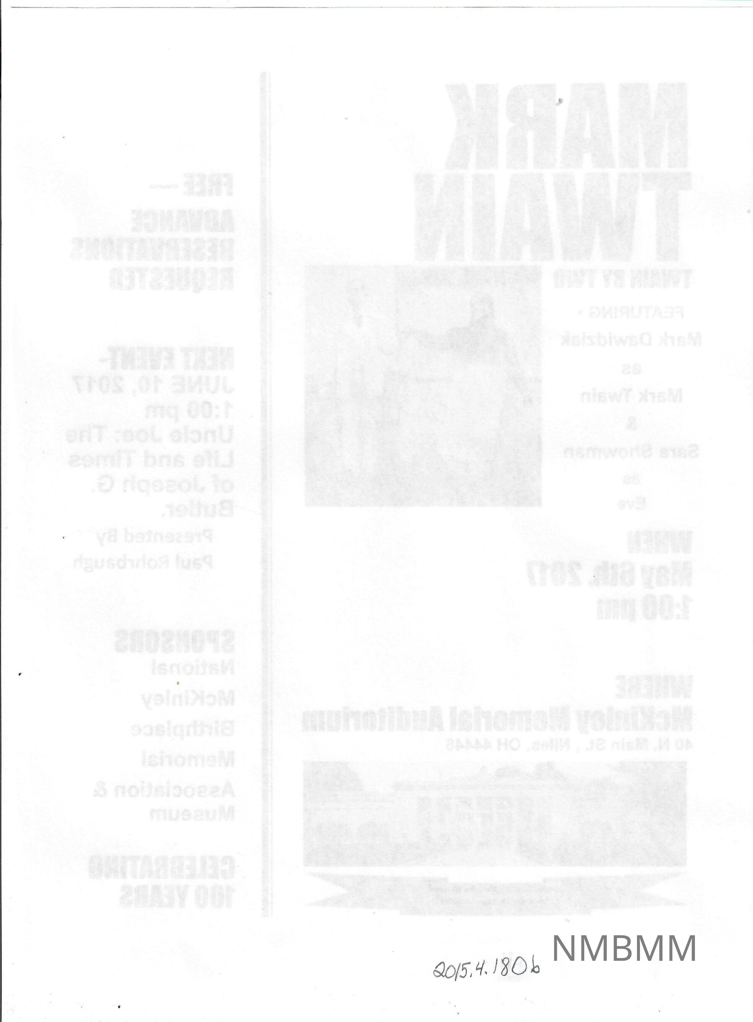 Flyer on plain white 8.5 x 11 inch multipurpose paper. The front of the flyer feature a photo of Sara Showman and Mark Dawidziak as a fictional character and Mark Twain. The title "Mark Twain: Twain by Two" is in bold black letters above and to the side of the photo. The word "Featuring" is in black letters beneath the title. Beneath this is "Mark Dawidziak as" and "& Sara Showman as" in blue letters. The names of their characters appear in black after the word as. The text "When" is in blue. Beneath this is "May 6th, 2017" 1:00 pm" in black lettering. The text "Where" is in blue letters. Then the text "McKinley Memorial Auditorium 40 N. Main St., Niles, OH 44446" is in black letters above the centennial logo. On the right side of the page the text "Free--" is in blue letters. The text "Advance Reservations Requested Next Event- June 10, 2017 1:00 pm Uncle Joe: The Life and Times of Jospeh g. Butler." is in black letters. The text "Presented by Paul Rohrbaugh" is in blue letters. The text "Sponsors National McKinley Birthplace Memorial Association & Museum Celebrating" is in black lettering. The text "100 Years" is in blue.