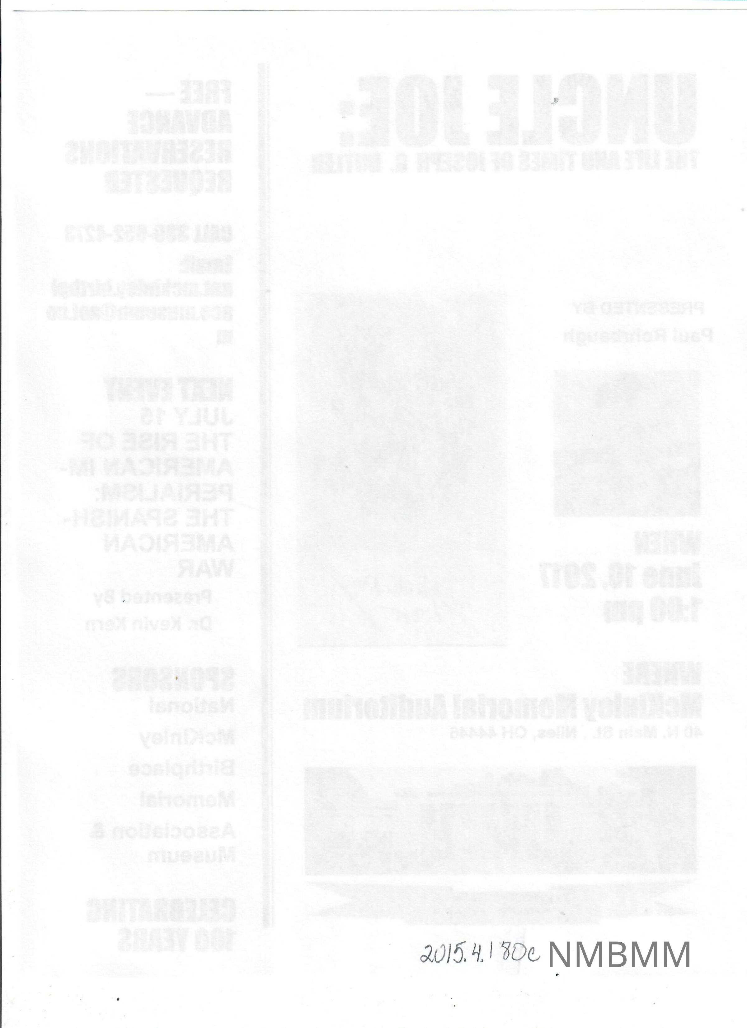 Flyer on white 8.5 x 11 inch multipurpose paper. The front of the flyer features the text "Uncle Joe" at the tope in black. The subtitle is in blue beneath the title. "Presented by" is in black letters. "Paul rohrbaugh is in blue letters. There is a photo of paul Rohrbaugh under this text. A photo of Joseph Butler is on the right. The text "When" is in blue letters. The text "june 10, 2017 1:00 pm" is in black letters. The text "where" is in blue letters. "McKinley Memorial Auditorium 40 N. Main St., Niles, OH 44446" is in black letters. The centennial logo is beneath the address.