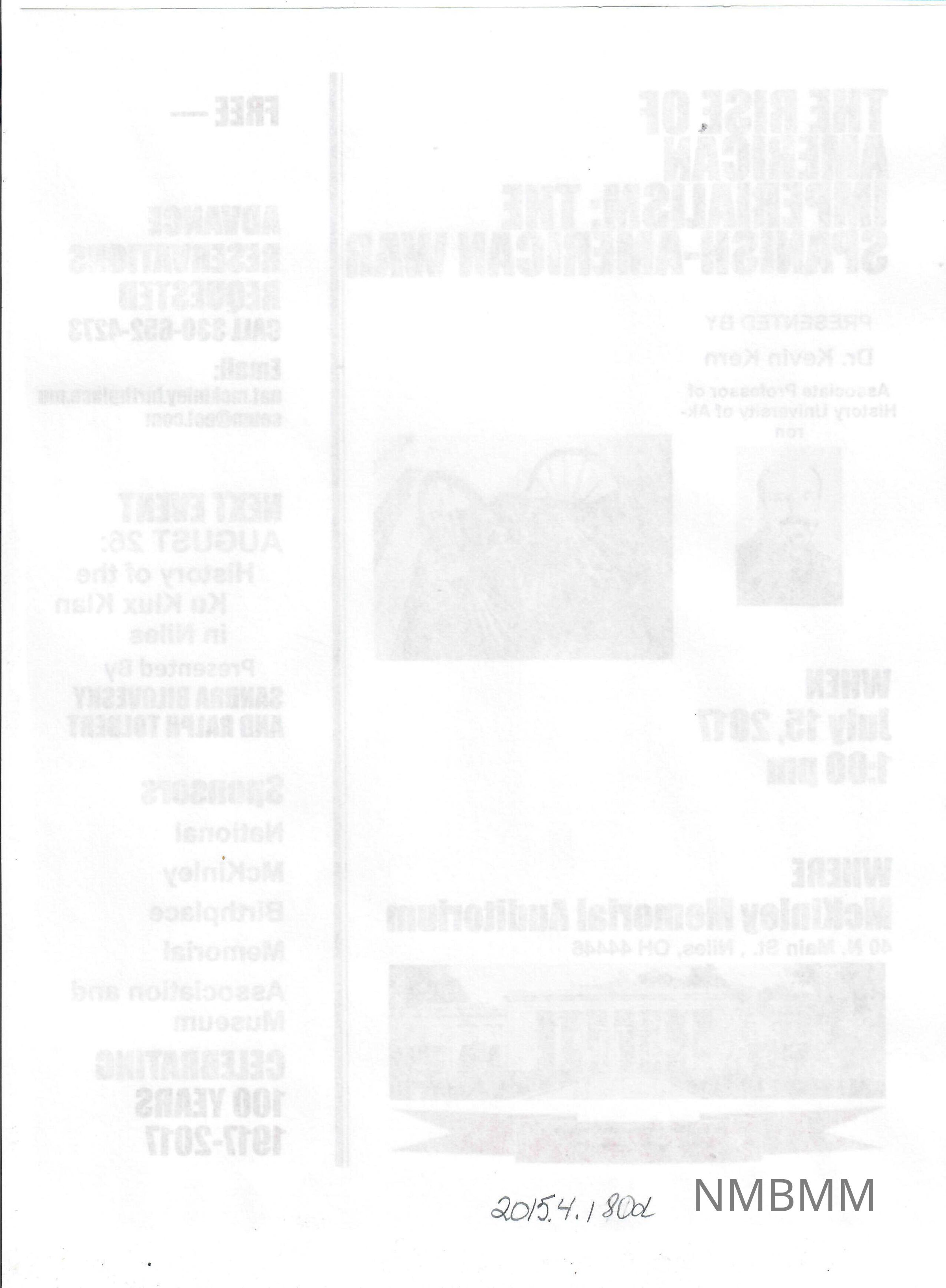 On white 8.5 x 11 inch multipurpose paper. This flyer is part of the Centennial Speaker series of the National McKinley Birthplace Memorial. The left side of the front reads as follows: The title is in bold black letters. "Presented by" is in black letters. "Dr. Kevin Kern Associate Professor of History University of Akron" is in blue letters. A photo of Dr. Kern, and a photo of the Spanish-American War cannon that is in the National McKinley Birthplace Museum follows. "When" is in blue letters. "July 15, 2017 1:00 pm" is in black letters. "Where" is in blue letters. "McKinley Memorial Auditorium 40 N. Main St. Niles, OH 44446" is in black letters. The centennial logo is beneath the address.