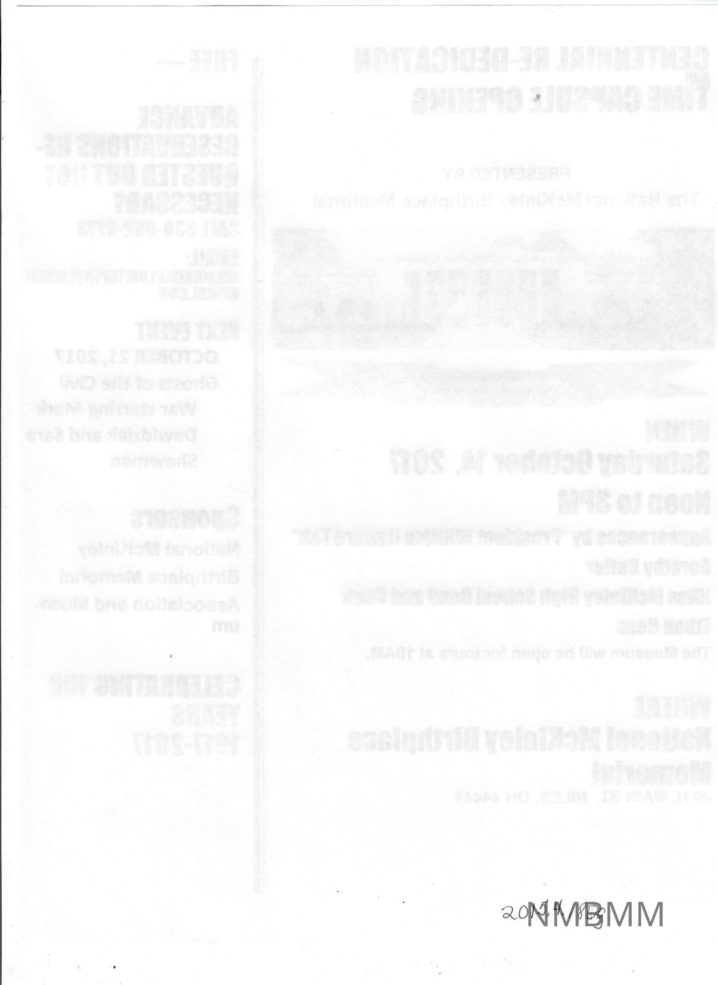 :Next event October 21, 2017 Ghosts of the Civil War starring Mark Dwaidziak and Sara Showman Sponsors National McKinley Birthplace Memorial Association and Museum Celebrating" is in black. :100 Years 1917-2017" is in red. The back is blank.Collection