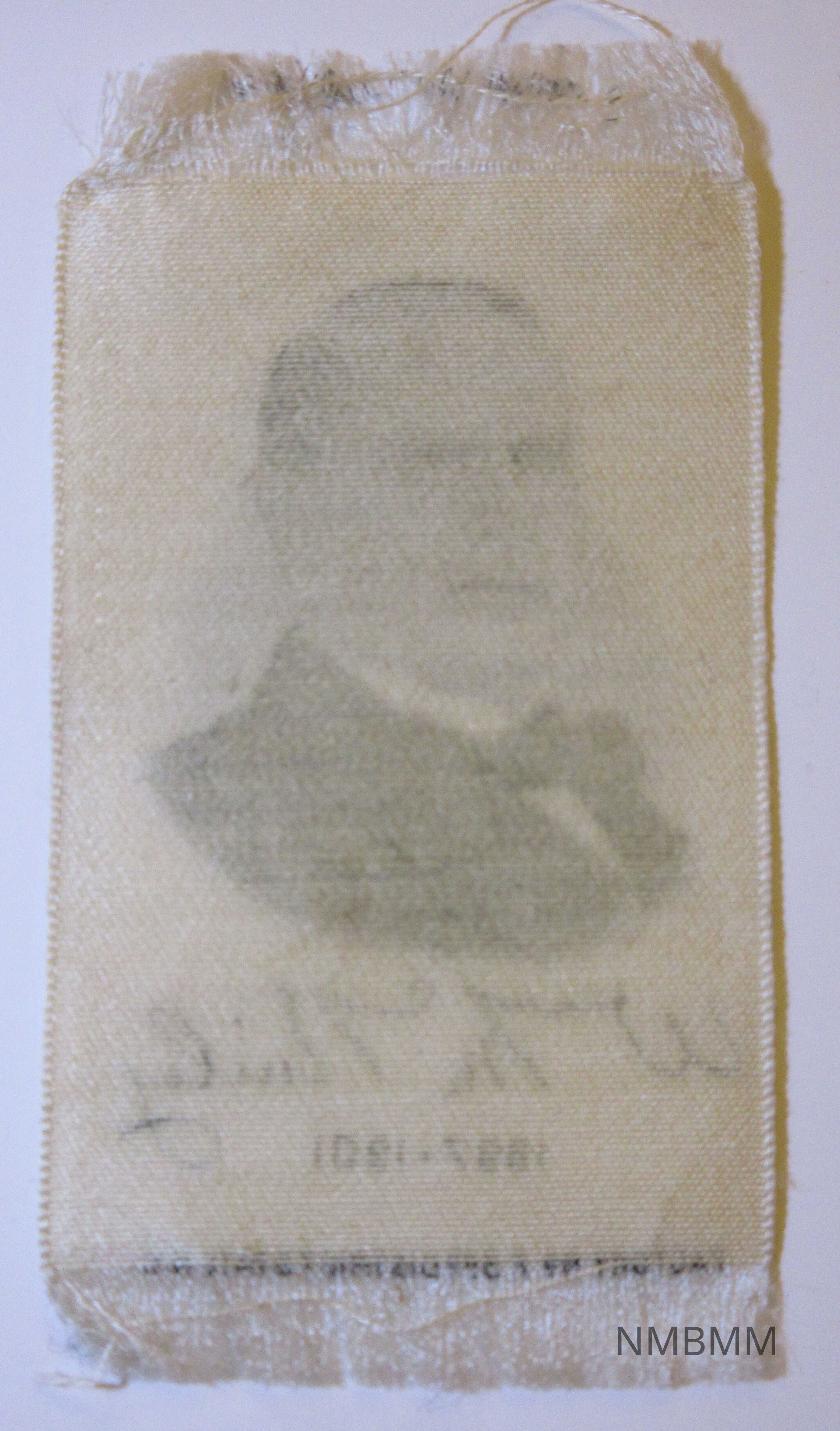 A white silk ribbon with black lettering that features a picture of McKinley, his signature and the dates 1897-1901 below. At the bottom is written "Factory No. 7, 3rd District State N.Y." The back is plain.