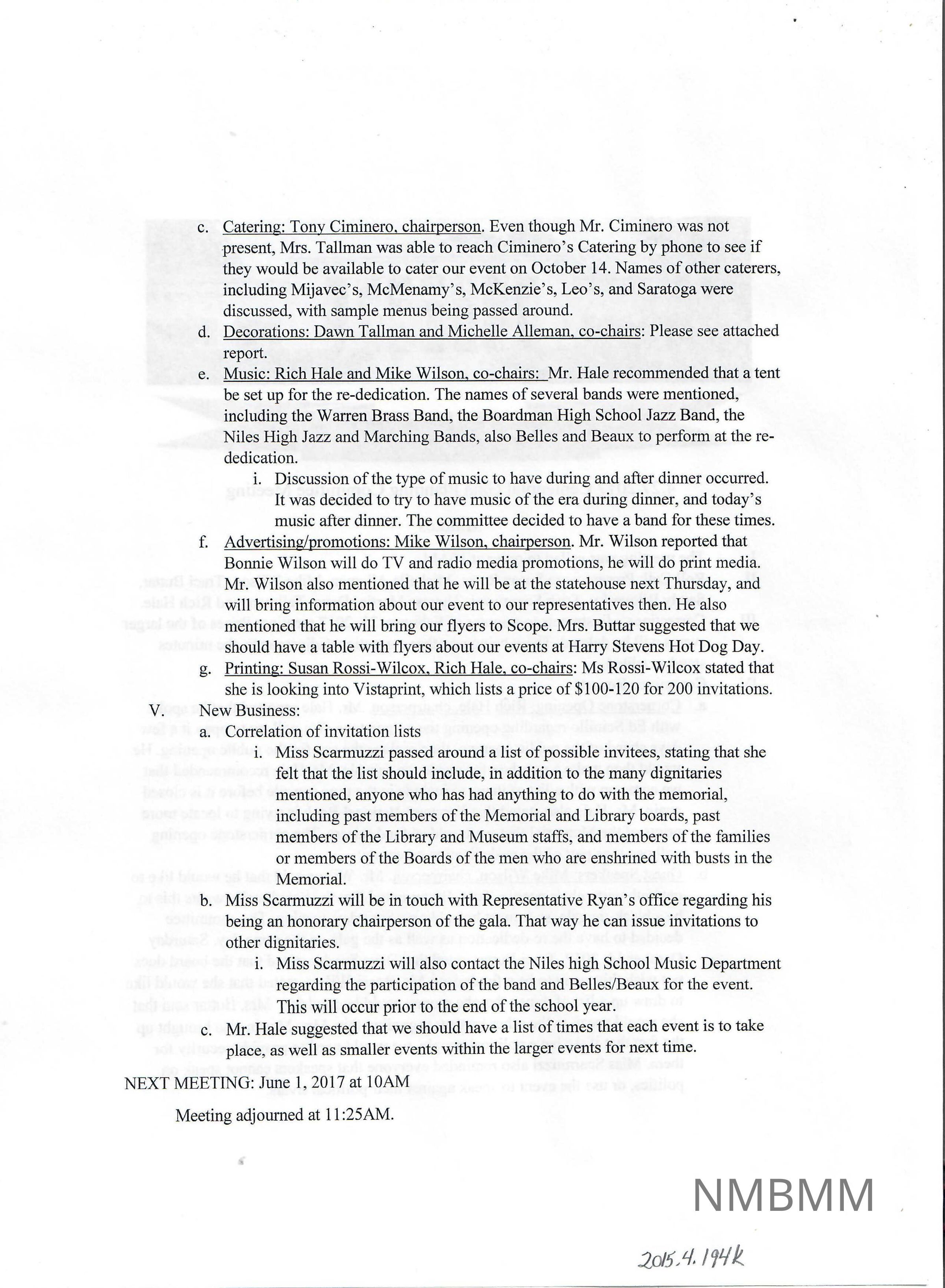 i. Miss Scarmuzzi will also contact the Niles high School Music Department regarding the participation of the band and Belles/Beaux for the event. This will occur prior to the end of the school year.