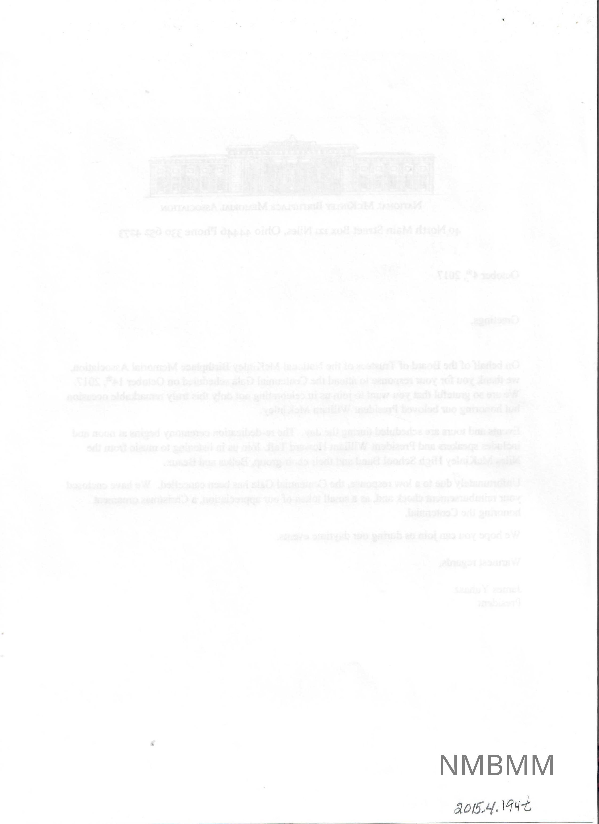 Letter sent to those who sent in their reservations for the National McKinley Birthplace Memorial's Centennial Gala when it was cancelled. It is typed on white paper, in black ink. It has the Memorial's logo at the top.