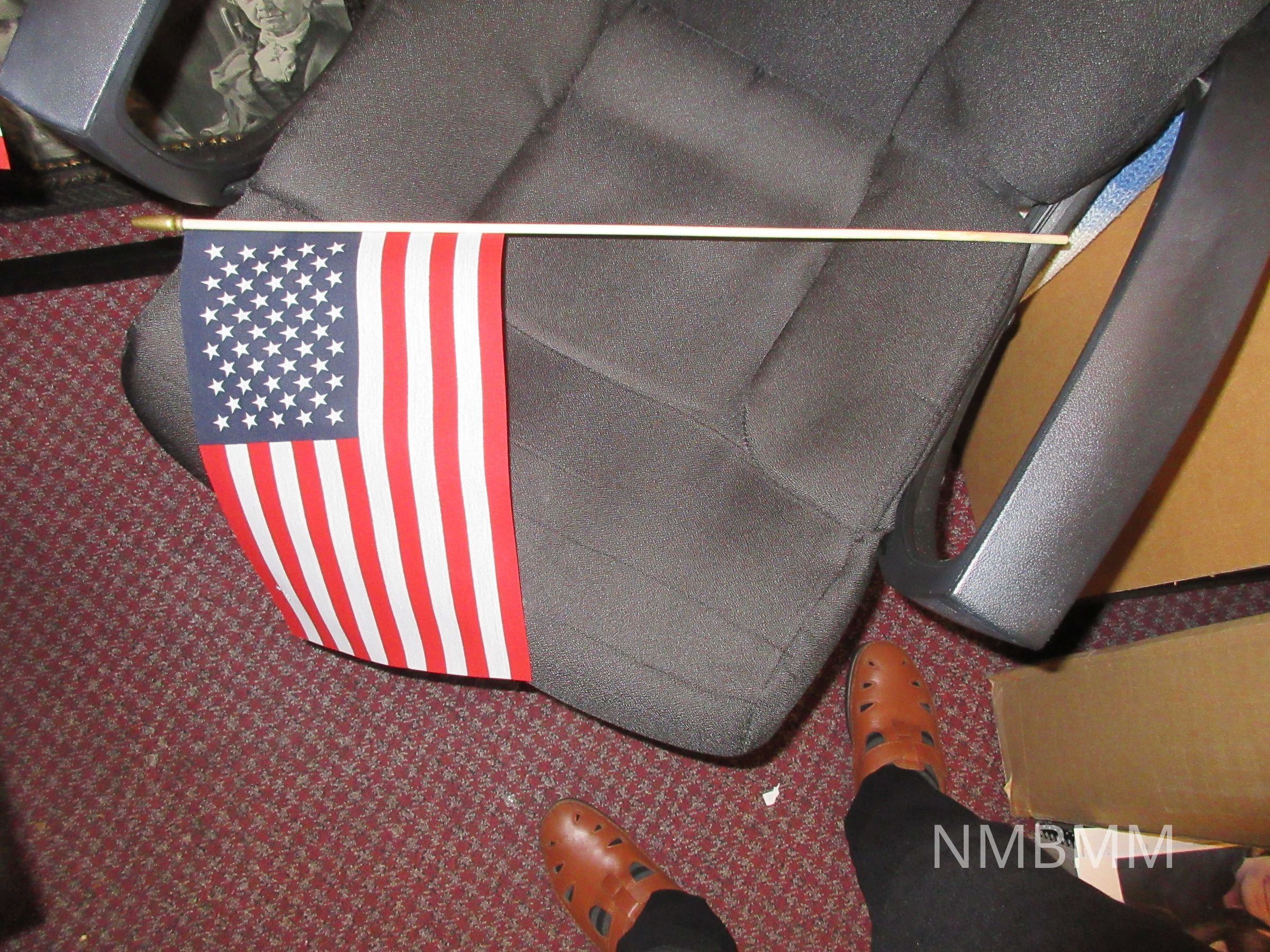 Small (8 x 12.5 inch) United States flag, on 23 inch dowel stick with 1.25 inch gold finial on top. This flag is one of two used a part of a floral decoration during the Centennial Celebration at the National McKinley Birthplace Museum in Niles, Ohio. the centennial re-dedication and celebration occured on October 14, 2017. there are spots at the bottom of the dowel stick where the sstick was placed into floral foam. The flag itself is of cotton muslin fabric, with thirteen stripes of alternating red and white, and 50 stars on a field of blue. The fabric is woven.