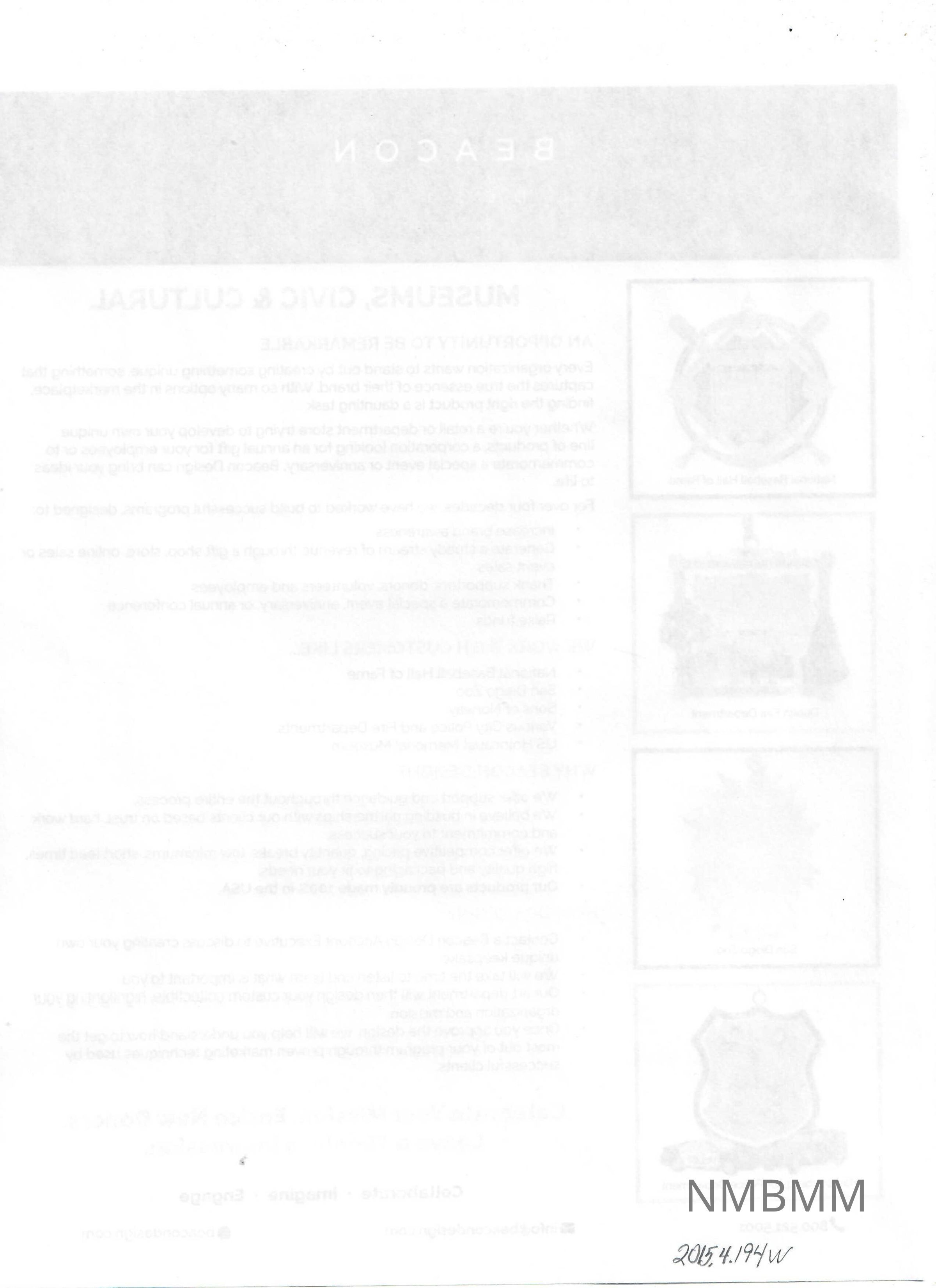 There are images of four ornaments produced by Beacon Design at the left of the page. They include the National Baseball Hall of Fame, Dublin Fire Department, San Diego Zoo, and Harrisonburg, VA Police Department.
