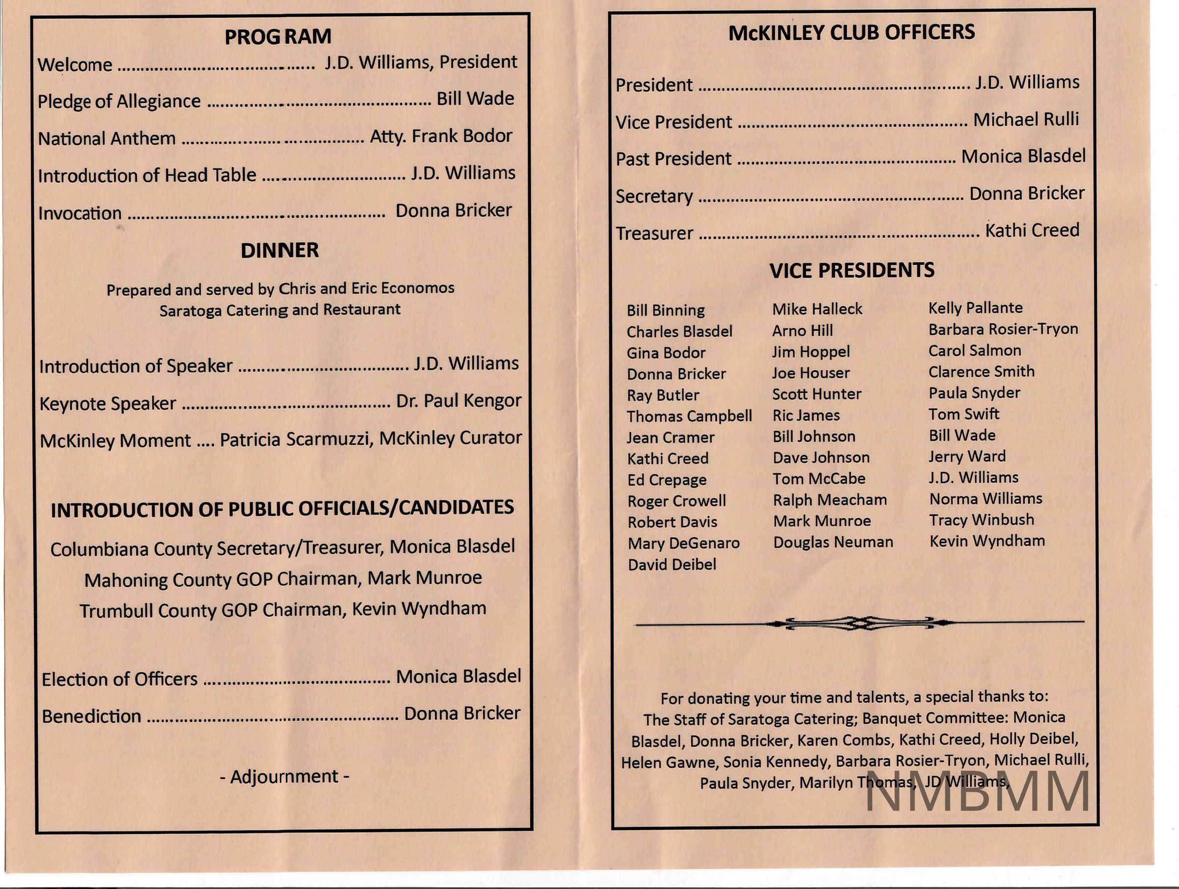Program listing the evening's agenda for the 102nd annual McKinley Club dinner, hosted at the National McKinley Birthplace Memorial Auditorium, September 28, 2017. Curator of the National McKinley Birthplace Museum, Trish Scarmuzzi, spoke at the dinner. The cover shows an image of McKinley and an image of the National McKinley Birthplace Memorial with an eagle above it. The images are in black and white, surrounded by an orange background. Text reads as follows, at the top of the page: "The Mahoning Valley McKinley Club One Hundred & Second Annual Banquet Thursday September 28, 2017 - 6:00 p.m. Niles McKinley Memorial Auditorium" Caption of the McKinley picture reads as follows: "President William McKinley January 29, 1843-September 14, 1901" Caption of the McKinley Memorial reads as follows: "It has been 100 years since the Niles McKinley Memorial's dedication on October 5, 1917, making this year's celebration truly special." Inside pages read as follows: On the left page: "Program Welcome...J.D. Williams, President Pledge of Allegiance...Bill Wade National Anthem...Atty. Frank Bodor Introduction of the Head Table...J.D. Williams Invocation...Donna Bricker Dinner Prepared and Served by Chris and Eric Economos Saratoga Catering and Restaurant Introduction of Speaker...J.D. Williams Keynote Speaker...Dr. Paul Kengor McKinley Moment...Patricia Scarmuzzi, McKinley Curator Introduction of Public Officials/Candidates Columbiana County Secretary/Treasurer, Monica Blasdel Mahoning County GOP Chairman, Mark Munroe Trumbull County GOP Chairman, Kevin Wyndham Election of Officers...Monica Blasdel Benediction...Donna Bricker Adjournment" The right hand page: "McKinley Club Officers President..J.D. Williams Vice President...Michael Rulli Past President...Monica Blasdel Secretary...Donna Bricker Treasurer...Kathi Creed Vice Presidents Bill Binning Charles Blasdel Gina Bodor Donna Bricker Ray Butler Thomas Campbell Jean Cramer Kathi Creed Ed Crepage Roger Crowell Robert Davis Mary DeGenaro David Deibel Mike Halleck Arno Hill Jim Hoppel Joe Houser Scott Hunter Ric James Bill Johnson Dave Johnson Tom McCabe Ralph Meacham Mark Munroe Douglas Neuman Kelly Pallante Barbara Rosier-Tyron Carol Salmon Clarence Smith Paula Snyder Tom Swift Bill Wade Jerry Ward J.D. Williams Norma Williams Tracy Winbush Kevin Wyndham For donating your time and talents, a special thanks to: The Staff of Saratoga Catering; Banquet Committee: Monica Blasdel, Donna Bricker, Karen Combs, Kathi Creed, Holly Deibel, Helen Gawne, Sonia Kennedy, Barbara Rosier-Tyron, Michael Rulli, Paula Snyder, Marilyn Thomas, JD Williams" Back cover reads as follows: "Paul Kengor, Ph.D., is professor of political science at Grove City College in Grove City, Pennsylvania and a New York Times bestselling author of over a dozen books. He is executive director of the Center for Vision & Values at Grove City College and a fellow with Stanford's Hoover Institution. Kengor is an Internationally recognized authority on several subjects and a frequent speaker and commentator. Dr. Kengor is often quoted in sources ranging from USA Today to the Washington Post and has been frequently interviewed by the BBC, MSNBC, NPR, Fox News, EWTN, the Christian Broadcasting Network, by radio hosts like Glenn Beck and Mark Levin, and TV personalities like Megyn Kelly and Bill O'Reilly. His articles have appeared in many publications: the New York Times, National Review, CNN.com, Wall Street Journal, Christianity Today, and others. He is a frequent columnist for the National Catholic Register, Crisis Magazine, and The American Spectator. Dr. Kengor's books have been published by leading houses such as HarperCollins, Simon & Schuster, Harvard University Press, Oxford University Press, and Ignatius Press. In 2017, Dr. Kengor released what has been described as his "magnum opus," A Pope and a President: John Paul II, Ronald Reagan, and the Extraordinary Untold Story of the 20th Century. Among his best sellers are the 2012 book, The Communist, and his 2004 classic, God and Ronald Reagan. Kengor is a frequent public speaker, with venues that include the Ronald Reagan Library, the Reagan Ranch, the National Press Club, The Heritage Foundation, American Enterprise Institute, the Gerald Ford Library, the National Presbyterian Church, and colleges ranging from the University of Virginia to the College of William and Mary. Kengor Received his doctorate from the University of Pittsburgh's Graduate School of Public and International Affairs and hi master's degree from The American University's School of International Service. He also holds an honorary doctorate from Franciscan University (Steubenville, Ohio). He and his wife, Susan, have eight children.