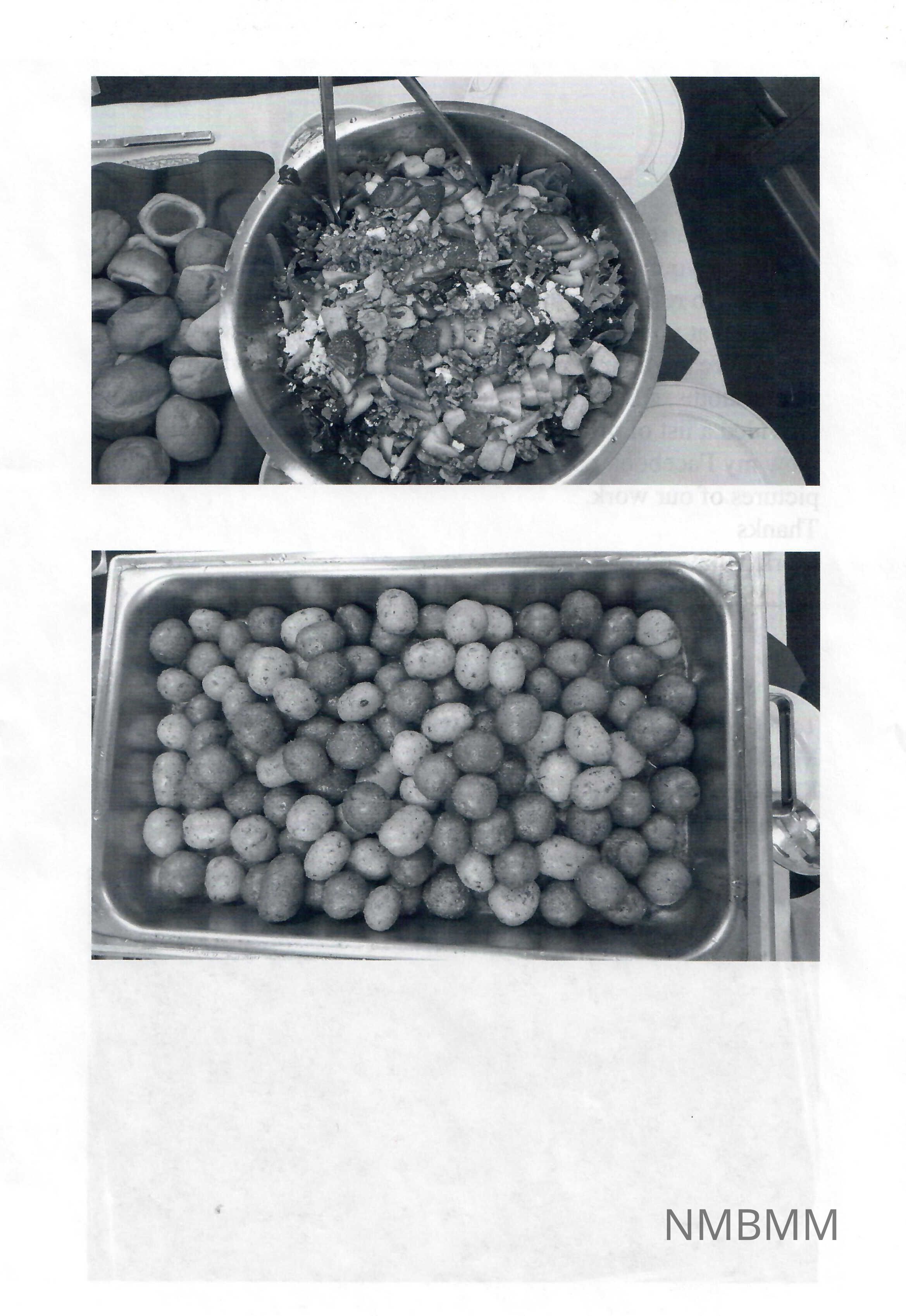 The back of the page shows two photos. The top photo shows a salad, and the bottom photo shows potatoes in a caterer's tray.Collection