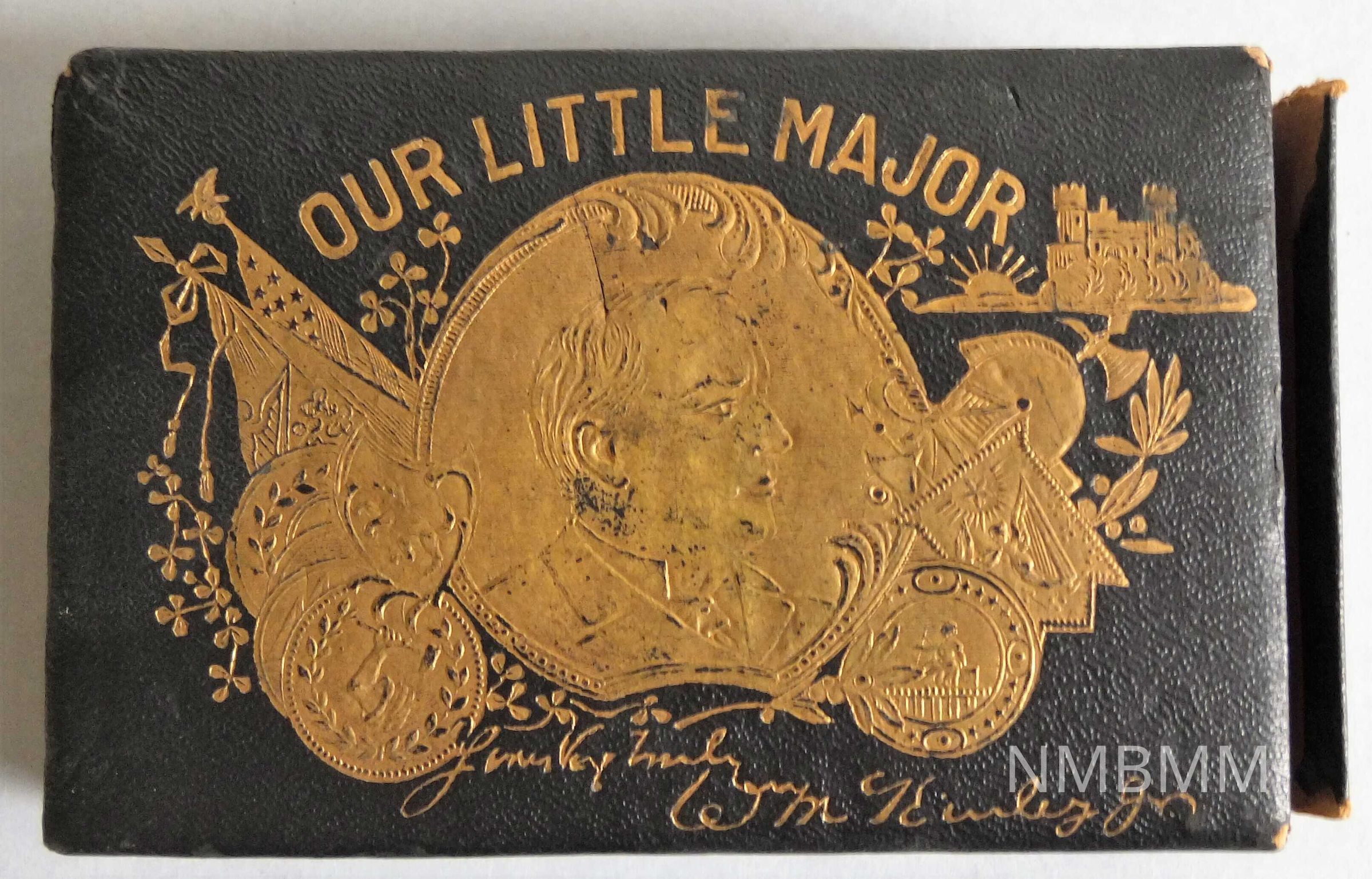 McKinley cigar box. The top features an image of McKinley surrounded by several seals and flags in gold, with the words "Our Little Major" and a facsimile autograph "Yours truly, Wm. McKinley, Jr."