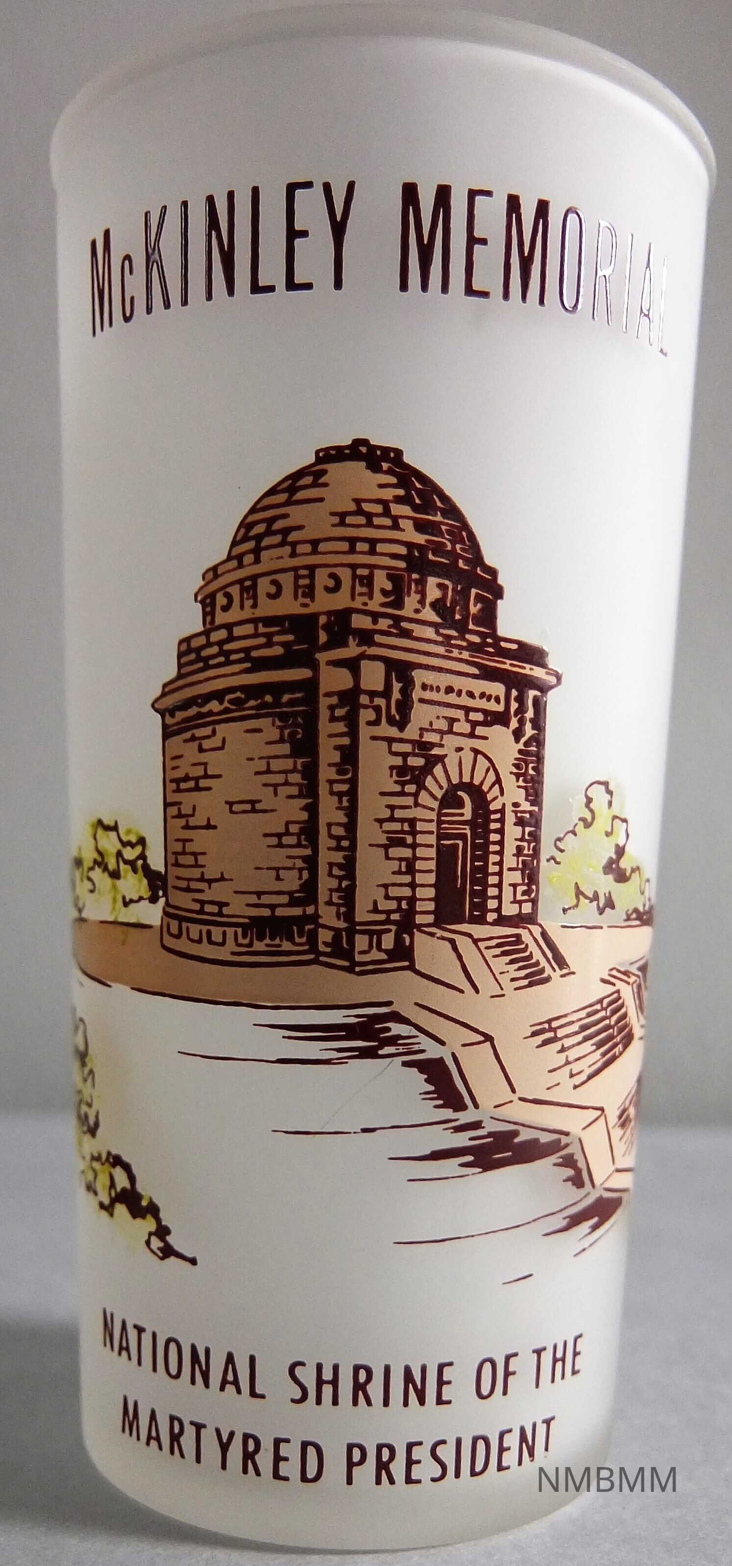 Frosted glass tumbler showing the National McKinley Memorial (tomb) in Canton, Ohio. The glass holds seven ounces and is similar in style to the Presidential Series of glasses. the front shows the tomb of President William McKinley, 25th President of the United States. The back includes the text "Historic Canton" in brown letters.Collection