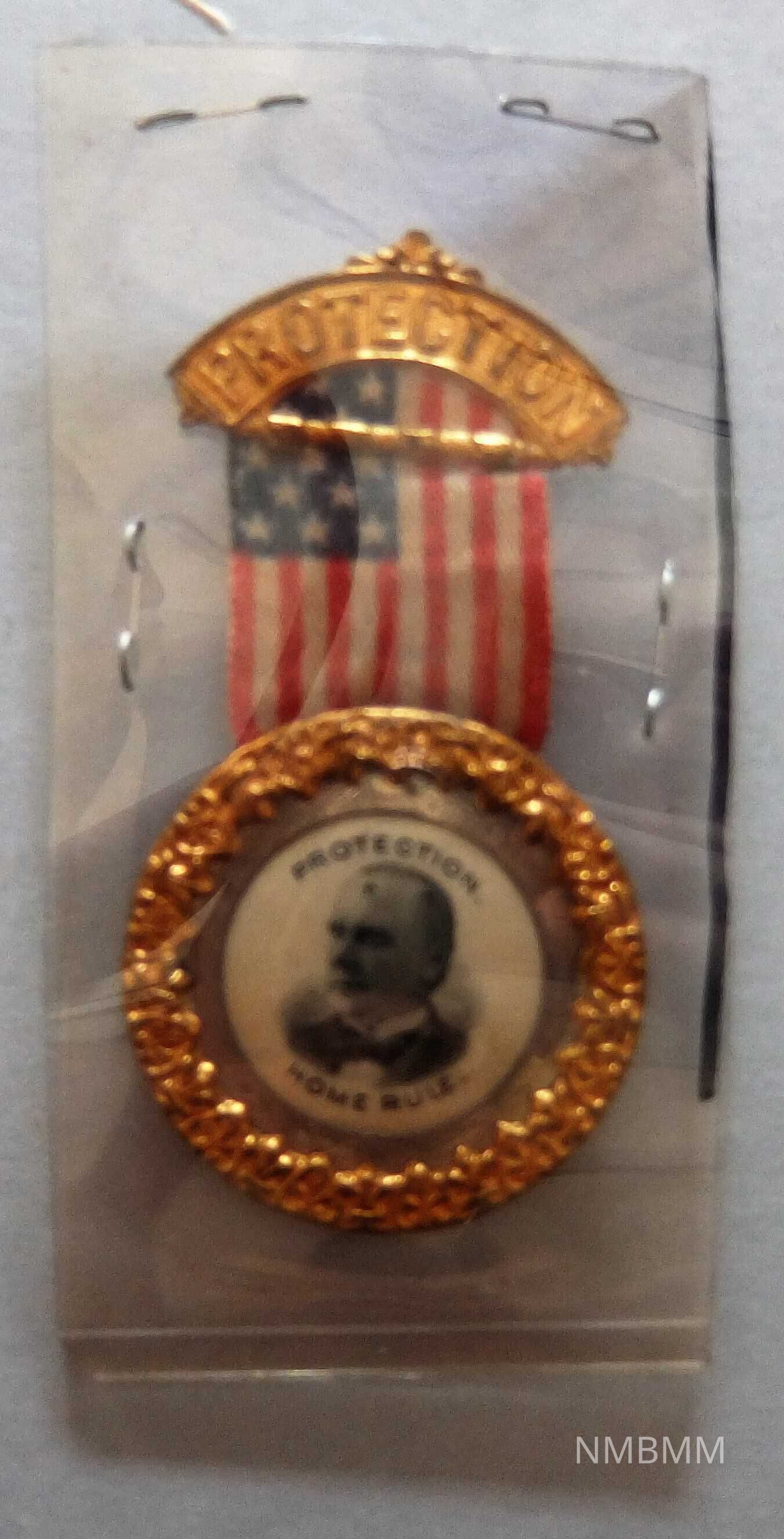 A gold campaign pin containing a portrait of McKinley. A cloth American flag is attached to the top of the button, with the word "Protection" engraved in metal atop the flag. The caption on the button itself reads, "Protection. Home Rule."