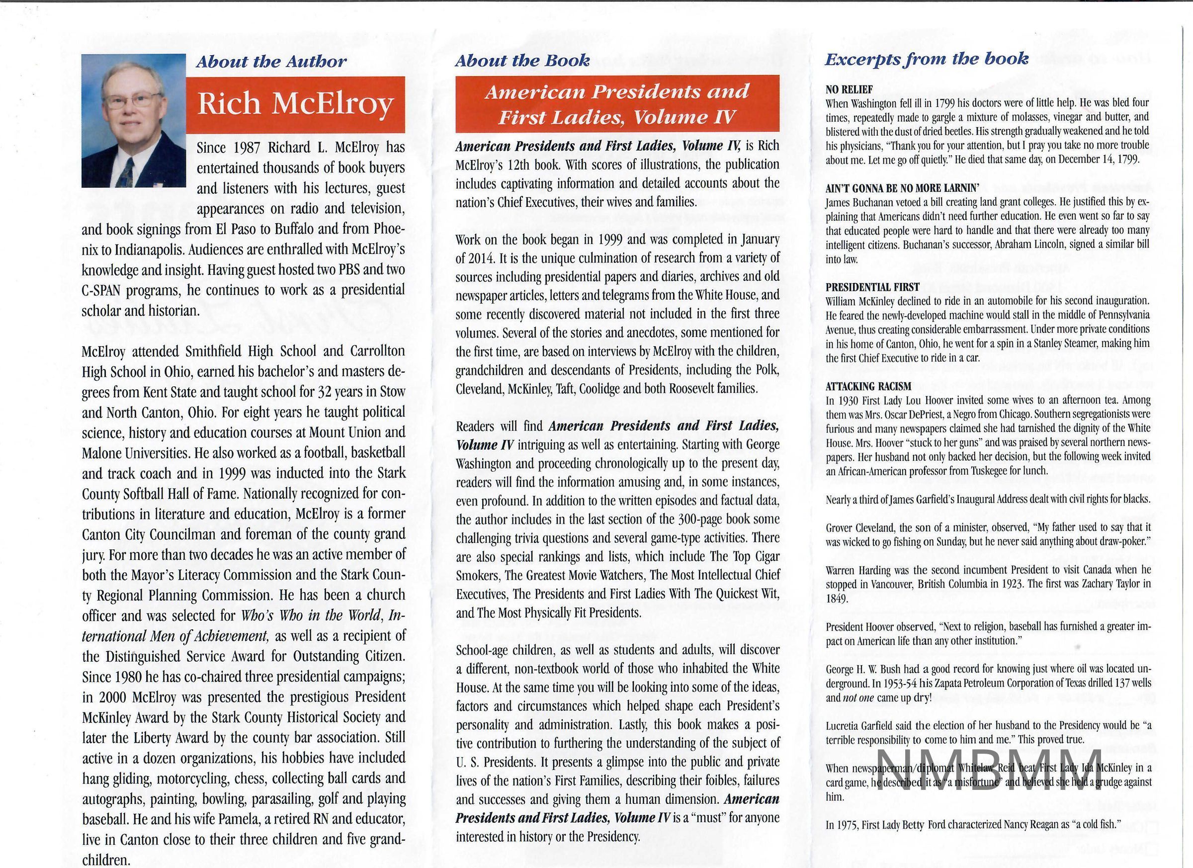 Promotional brochure for the book "American Presidents and First Ladies." The brochure features the title above the Presidential seal, and the author's name at the bottom. This is a tri-fold brochure, with a brief biography, and brief summary of the book, as well as excerpts from the book, some reviews, and ordering information.Collection