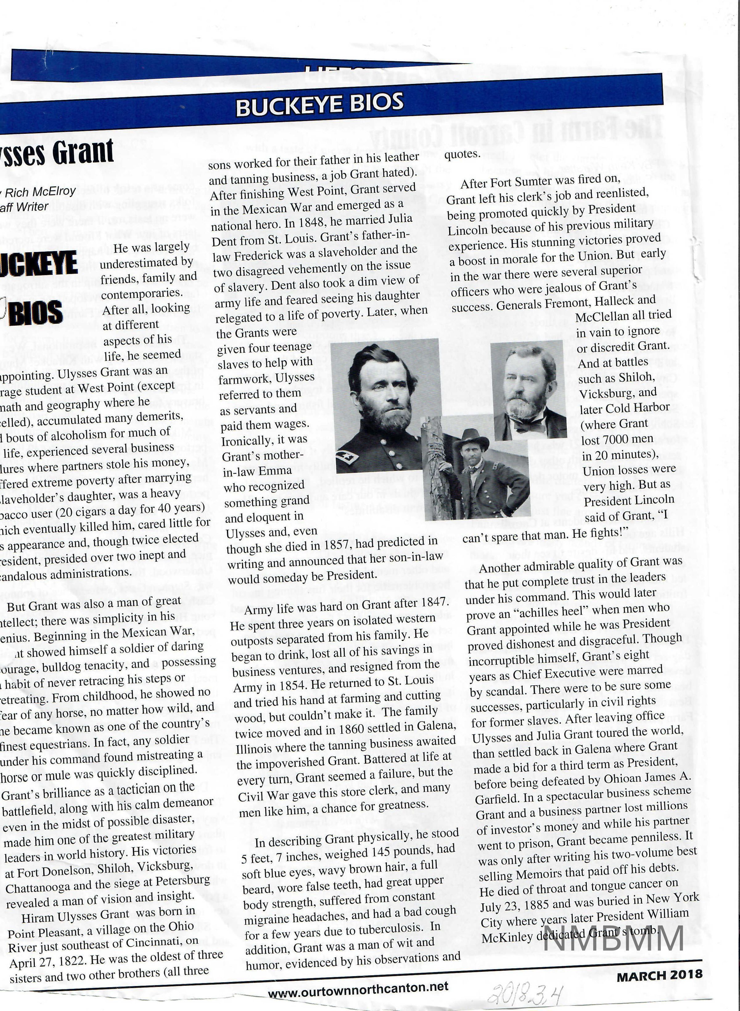 Pull out of articles featured in the Our Town North Canton magazine of March 2018. titles include: "The Farm in Carroll County," "Ulysses Grant," and It's Gru-vee."Collection