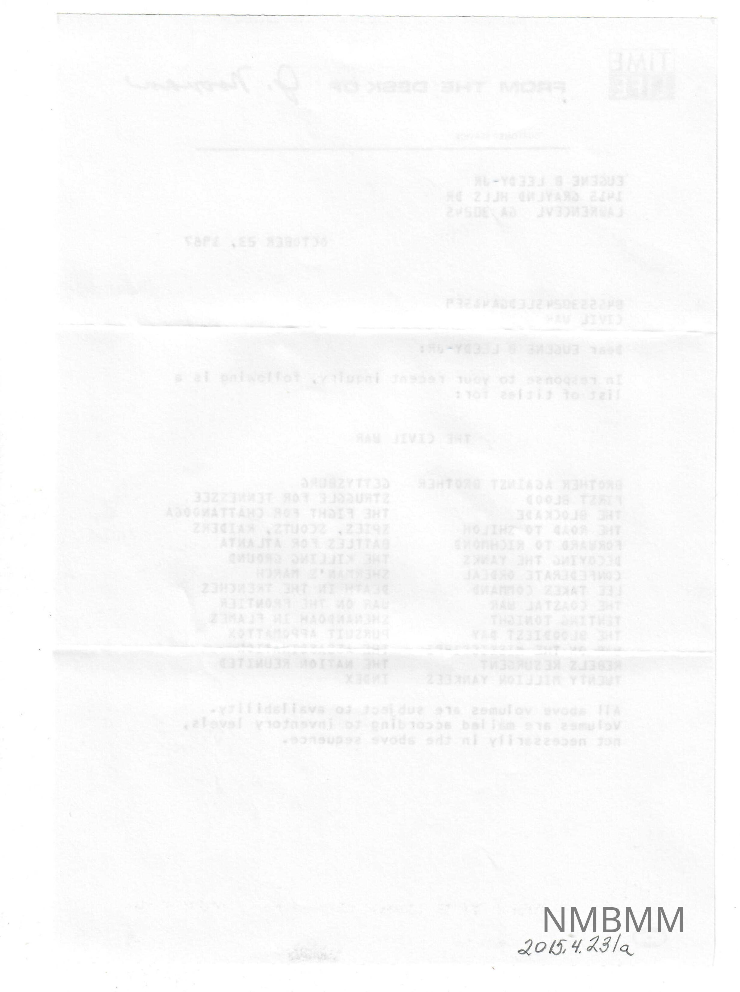 Letter from J. Noonan to Eugene B. Leedy, Jr. responding to his inquiry about a list of all titles for Time-Life Books' "The Civil War" series.Collection
