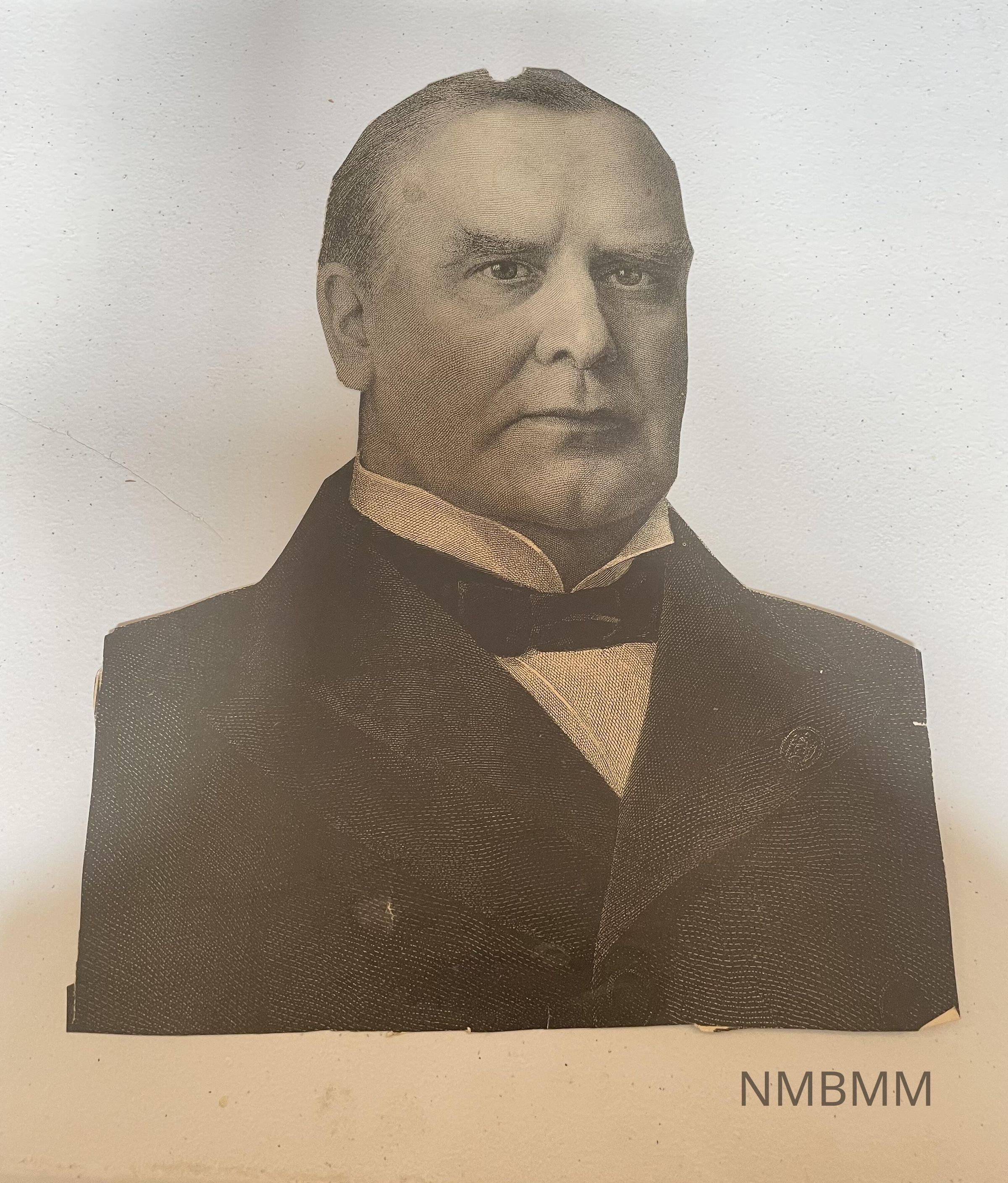 A black and white lithograph of William McKinley found in the pages of the book "Porfolio of Photographs." It appears to have been cut out of something, perhaps a book or magazine. The black has stains.Collection