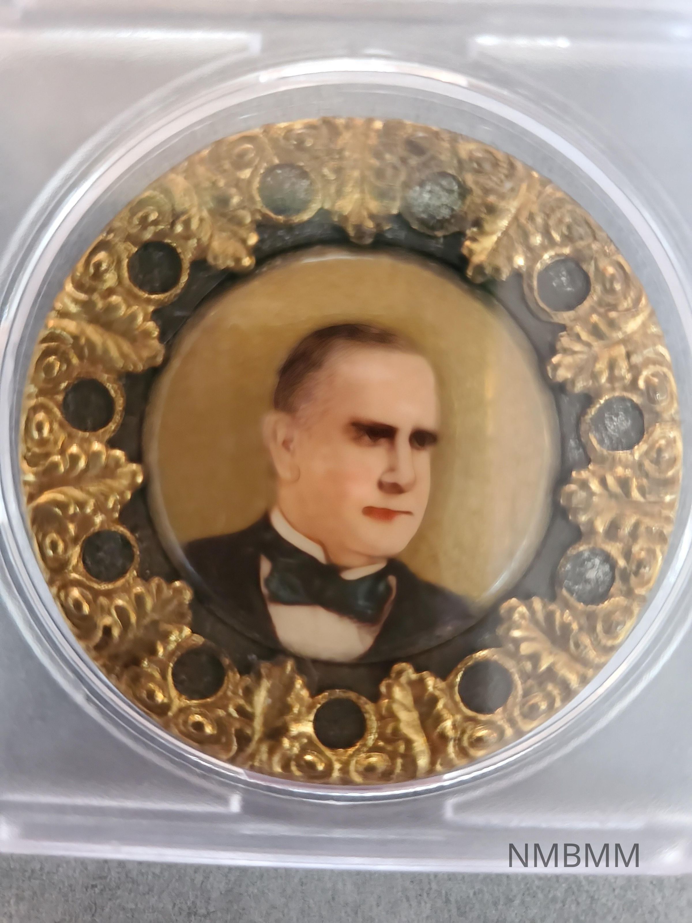 Small round pin, with ornate gold frame. Painted color portrait of William McKinley in center.