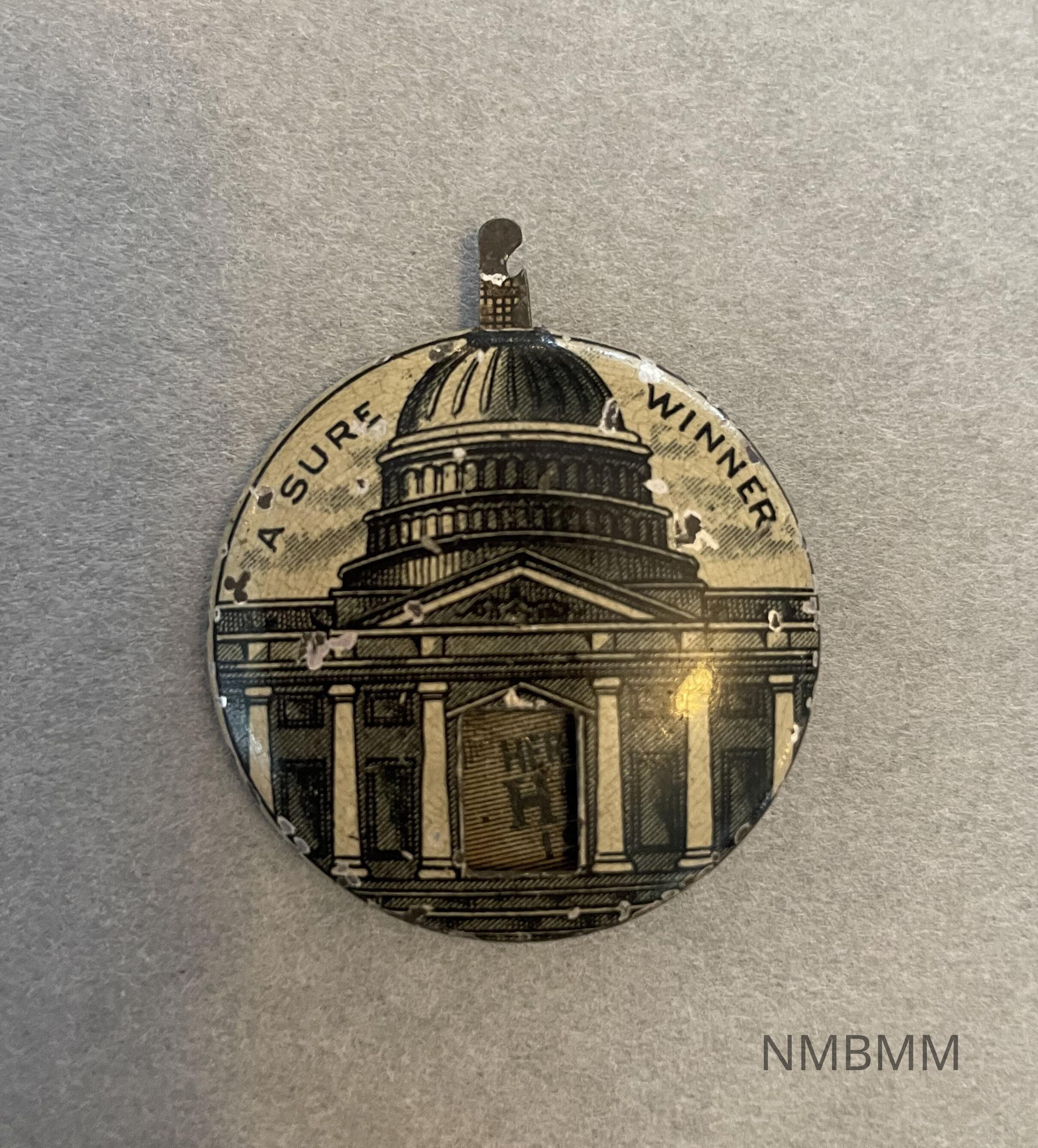 Pin shows an image of the United States Capitol Building, with the caption "A Sure Winner" above the building, and "Here He Is" showing through the doorway, 1896.