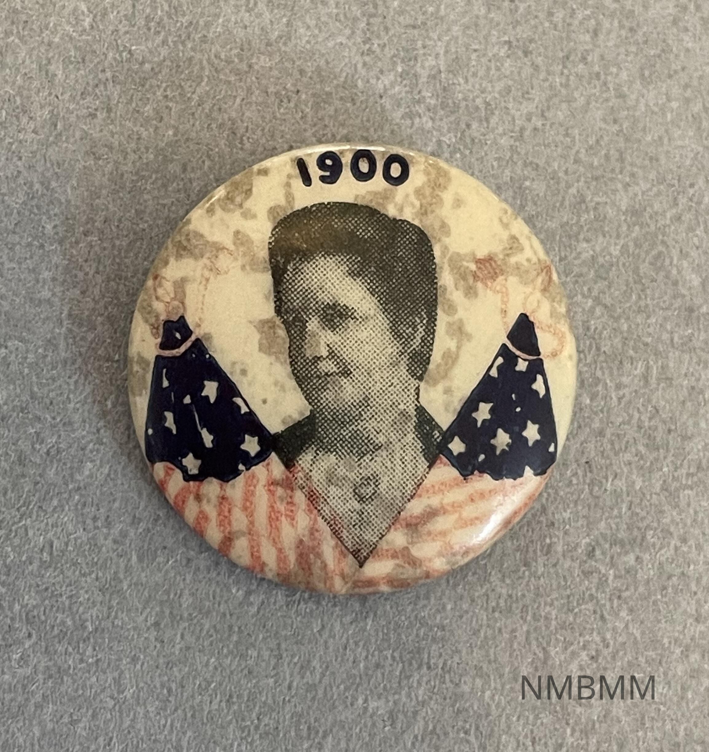 Pin with an image of a woman flanked by two United States Flags. "1900" appears above her head.