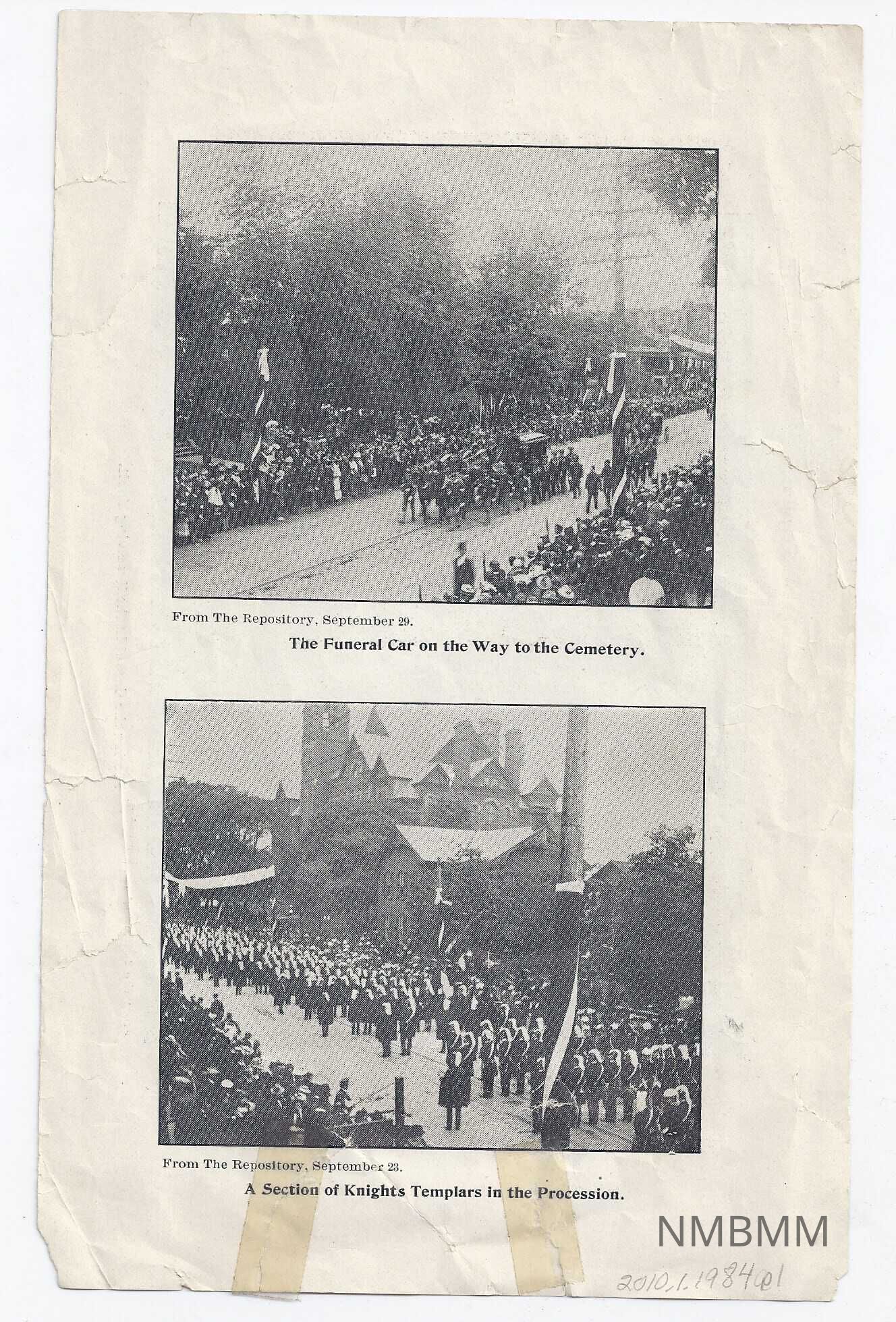 Pages from the Canton Repository Supplement about the funeral of President McKinley. The first page shows A photo with the captions "From the Repository September 29" and "The Funeral Car on the Way to the Cemetery." A second photo is also on the page. The captions read "From the Repository, September 23" and "A Section of Knights Templars in the Procession." The back of the page shows a photo of the receiving vault with the captions "From the Repository, September 22" and "Placing the Casket in the Receiving Vault."