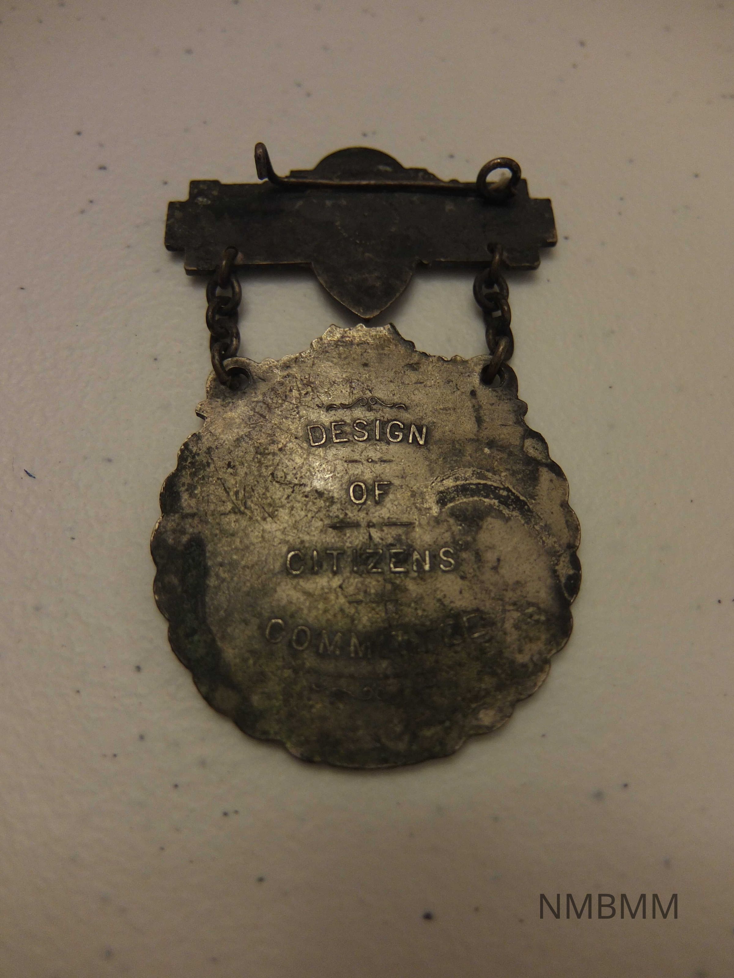 This is a 2 part silver souvenir medal from the dedication of the McKinley Monument, Canton, Ohio, 1907. The front of the banner part measures 1 7/8 in. x 1 in. and reads "Official Souvenir." The round medallion part, 1 3/4 in. in diameter, is suspended from the banner by 4 chain links on either side. The McKinley Monument is etched into the medallion with a small fleur de lis above it and a border around it. The words reading " The McKinley Memorial. Dedicated At Canton, O. Sept. 30th, 1907" surround the monument. At the bottom center is a small bow and laurel leaves extending out and upwards around the sides. On the reverse side of the banner in a circular pattern is the manufacturer marking "The Whitehead & Hoag Co. Newark, N.J." There is also a pin for attachment .On the reverse side of the medallion are the words reading "Design of Citizens' Committee." Below that are again the manufacturer's name "The Whitehead & Hoag Co. Newark, N.J."