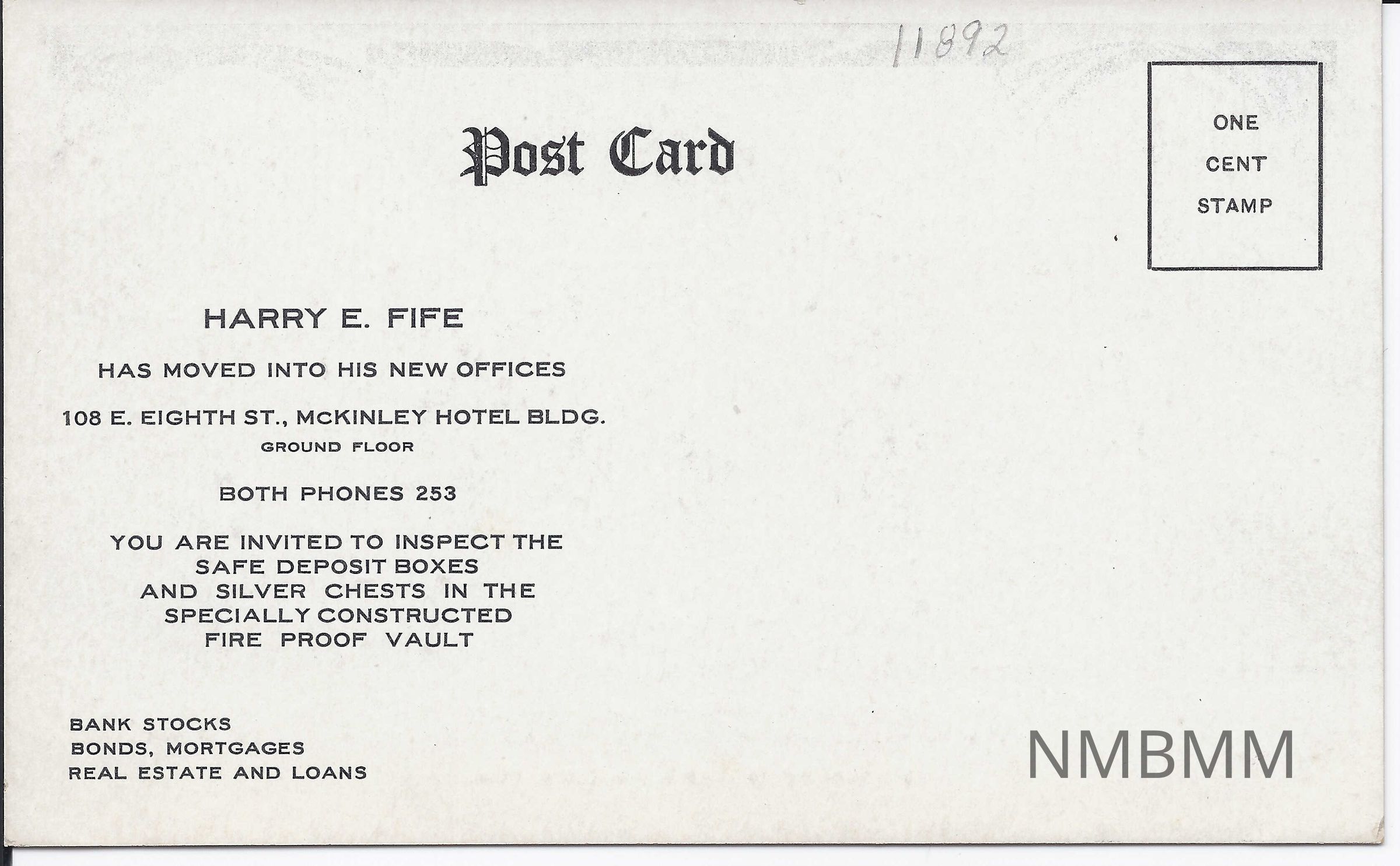 The item is a postcard featuring a picture of William McKinley at 28 years old and one of Ida McKinley at 22 years old. There is also a picture of the First Presbyterian Church with the caption, "The First Presbyterian Church of Canton, Ohio, Corner Tuscarawas and Plum St., now McKinley Ave., with uncompleted tower as it appeared at the time of marriage of Wm. McKinley, Jr., and Ida Dewalt Saxton, January 25th 1871." Copyright 1907 by Harry E. Fife Canton, Ohio. On the back, it says, "Harry E. Fife has moved into his new offices, 108 E. Eighth St., McKinley Hotel Bldg., Ground Floor, Both Phones 253, You are invited to inspect the safe deposit boxes and silver chests in the specially constructed fire proof vault, bank stocks, bonds, mortgages, real estate, and loans."Collection