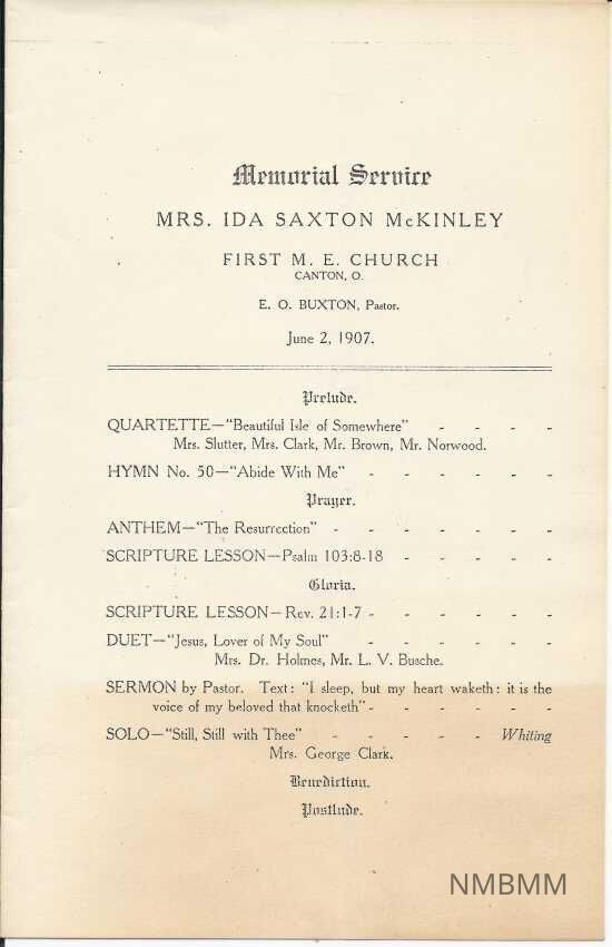 The item is a memorial service program for Mrs. Ida Saxton McKinley at First M.E. Church in Canton, Ohio. The front of the program lists the order of events and the back has a group of verses.Collection