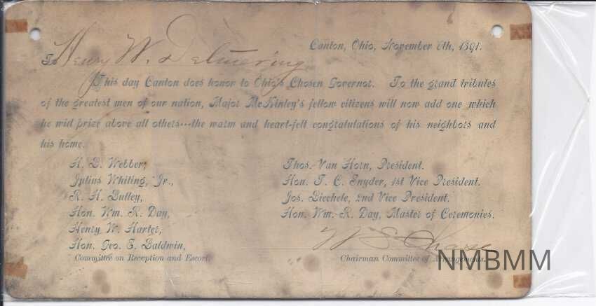 The item is an announcement stating that Canton is honoring the chosen Governor, Major McKinley. The item was intended for Henry W. ___________ ( last name not legible) and was signed by W. S. Chase, The announcement was dated November 6, 1891 in Canton, Ohio.