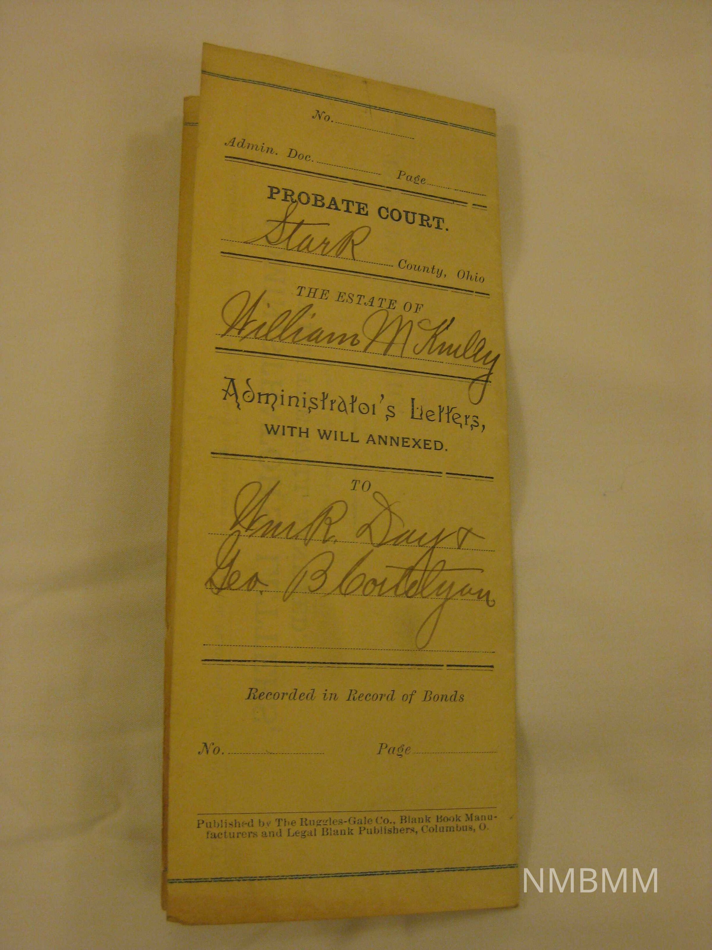 The item is a will for the estate of William McKinley. It was issued in Stark County, Ohio to William R. Day and George B. Cortelyou on September 30, 1901. It was signed by the judge of the probate court, Maurice E. [Anngos]