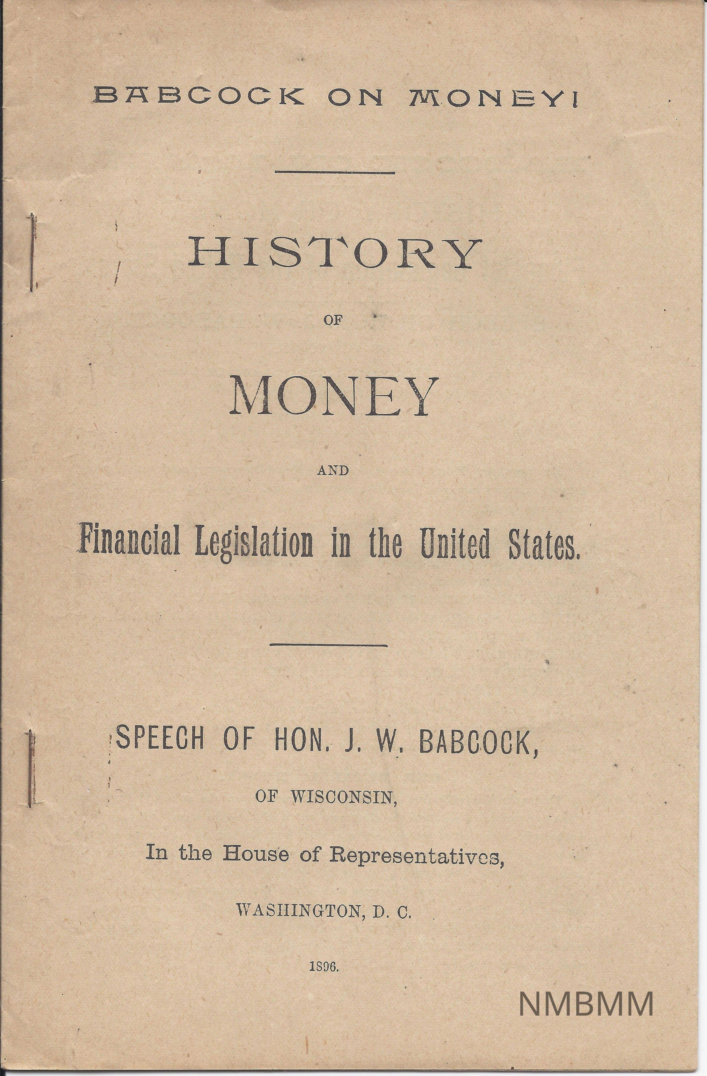 The item is a speech on the History of Money and Financial Legislation in the United States by Hon. J.W. Babcock of Wisconsin. The speech was given in Washington, D.C. in 1896 and was titled, " BABCOCK ON MONEY!"Collection