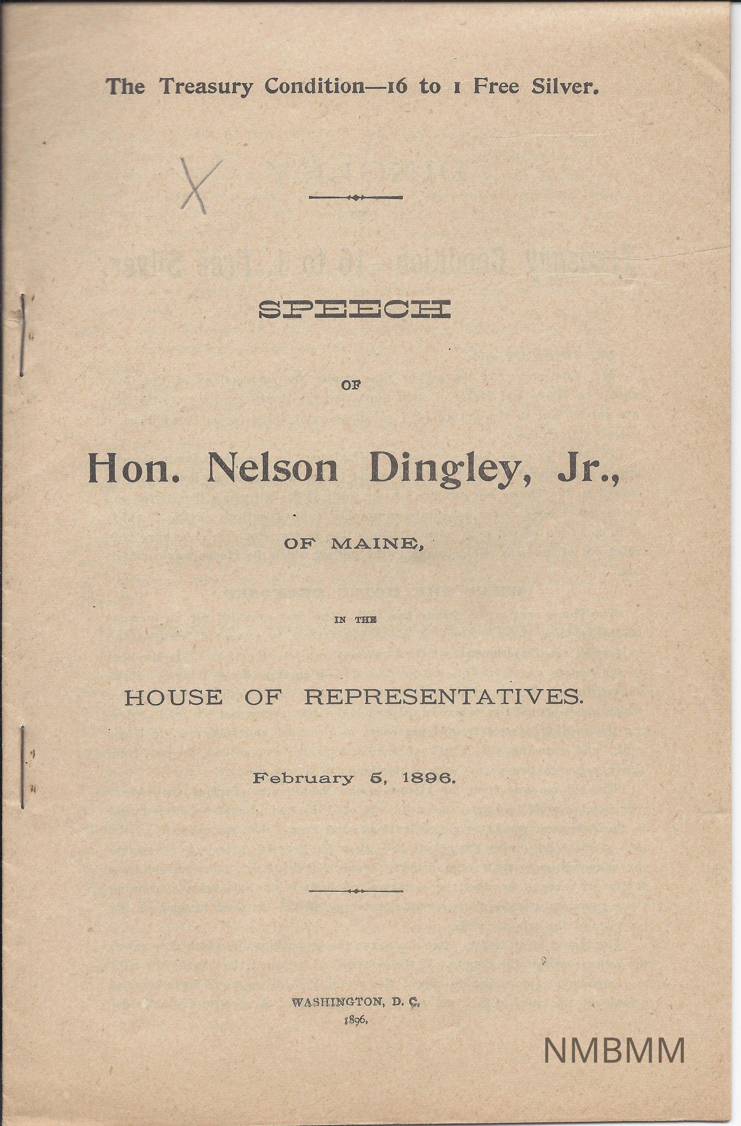 The item is a speech of Hon. Nelson Dingley, Jr. of Maine in the House of Representatives in Washington, D.C. on February 5, 1896. The title of the speech is " The Tresasury Condition- 16 to 1 Free Silver." There is an X written in pencil on top left.Collection
