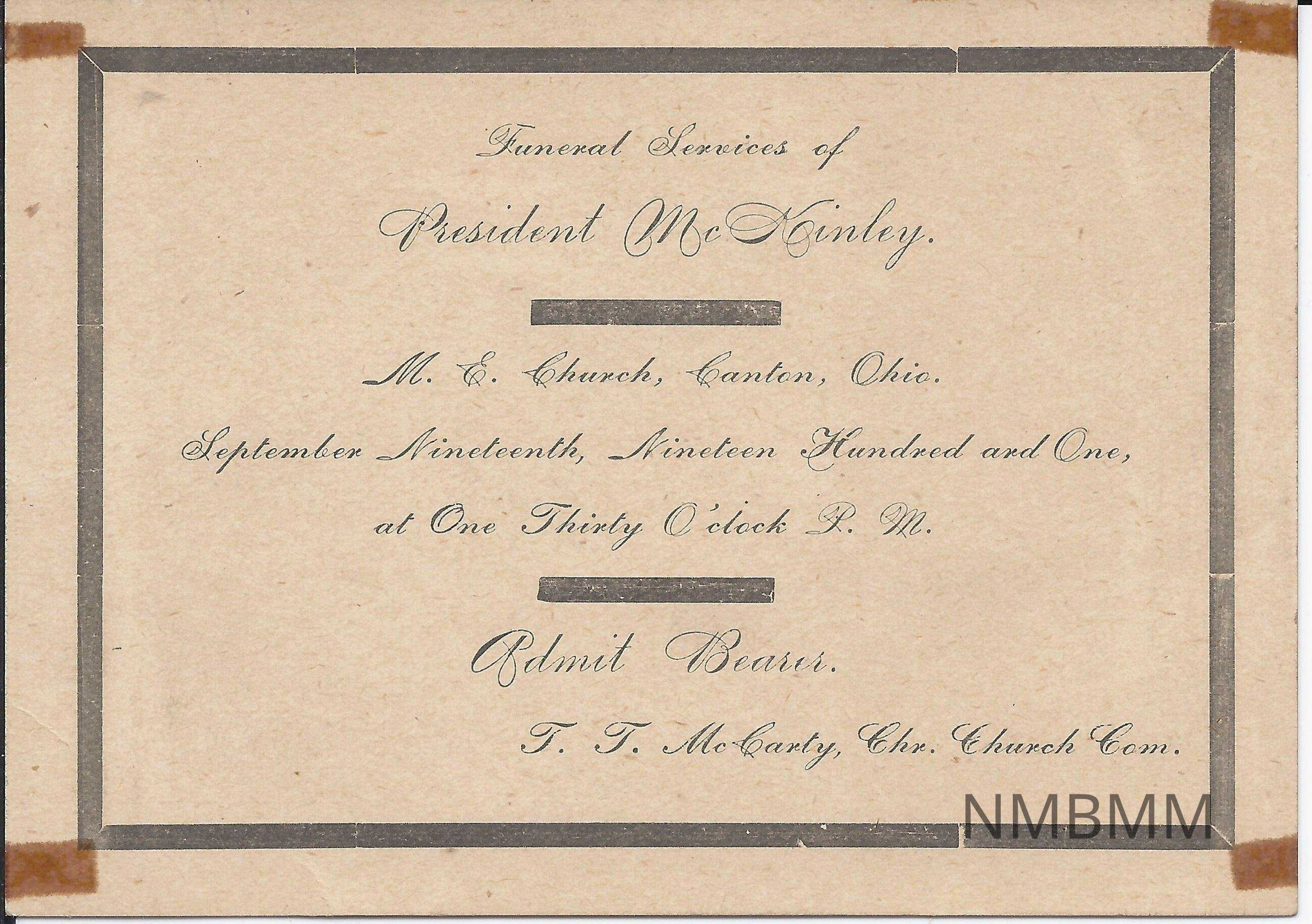 An admission card for a bearer at William McKinley's funeral services.The Funeral took place at M. E. Church, Canton, Ohio on September 19, 1901 at 1:30 PM. The card was issued by T.T. McCarty, Chair of the Church Committee.