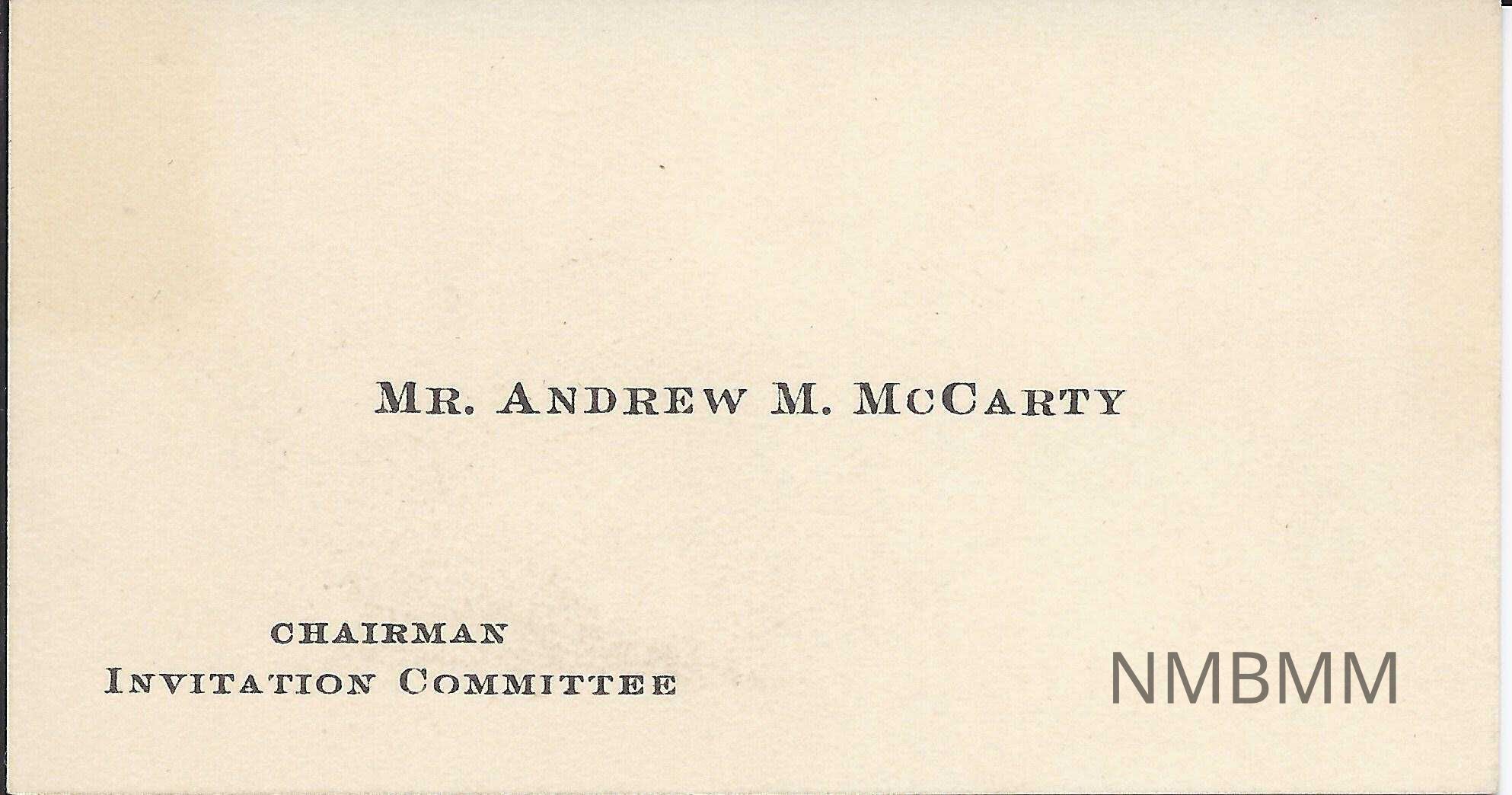 A business card for Mr. Andrew M. McCarty, chairman of the invintation committee for the McKinley National Memorial Dedication.Collection