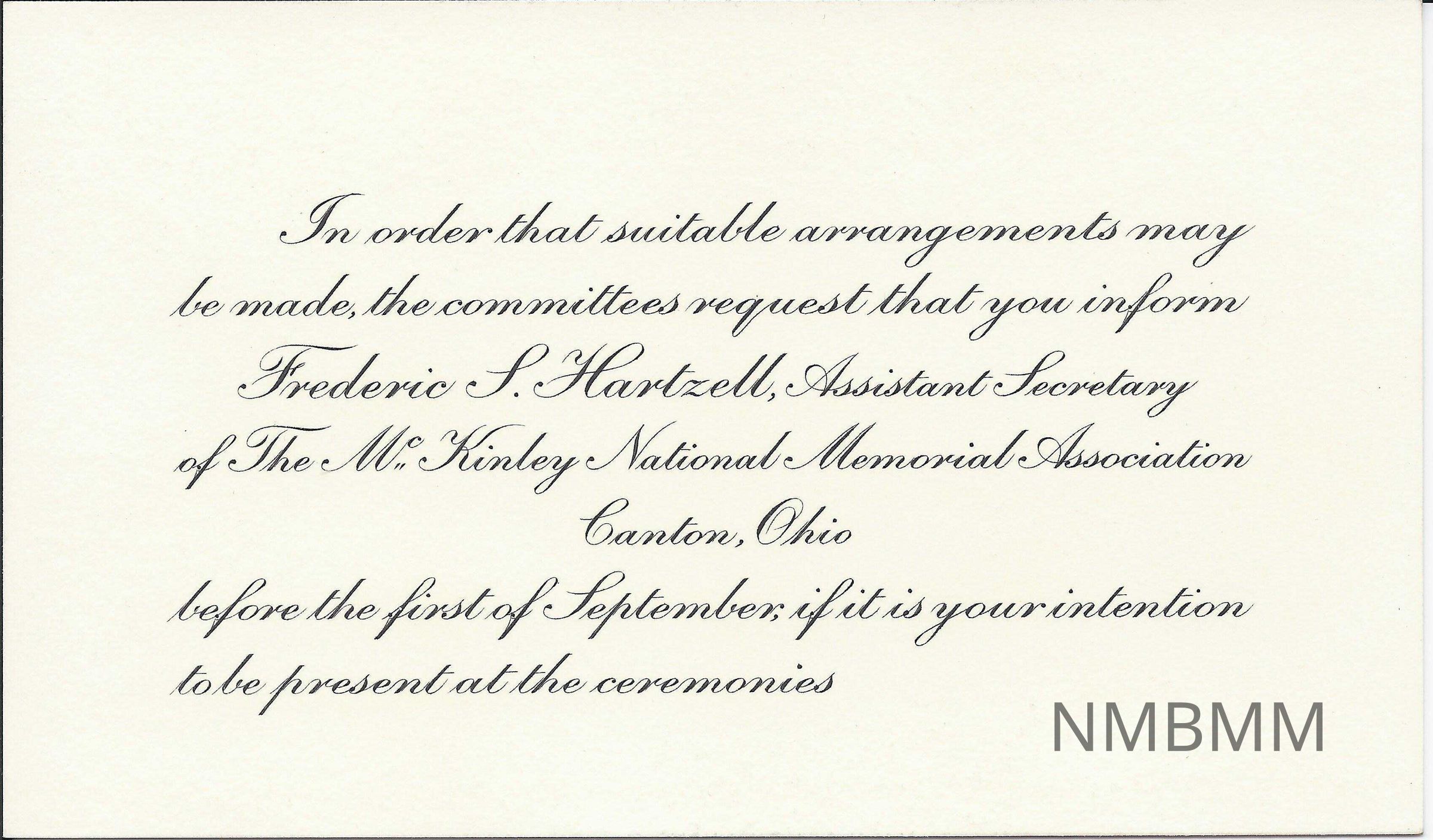 A request informing people to let Frederic Hartzell, Assistant Secretary, know before September 1st if they will be attending the dedication ceremonies.