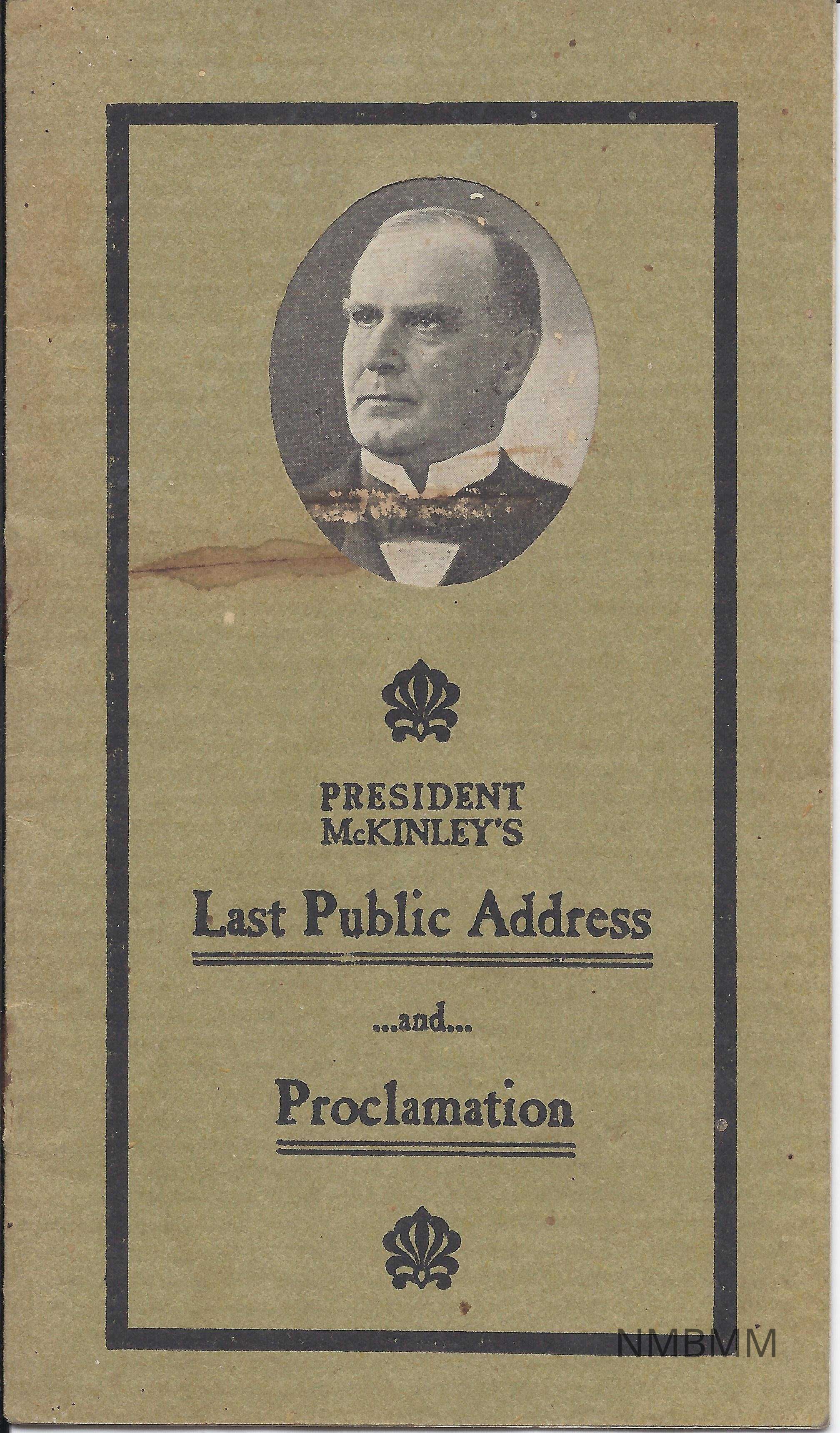 A small booklet containing William McKinley's Last Public Address and Proclamation. He is quoted on the back cover, and Louisiana Purchase Exposition 1903 is printed on the back too.Collection