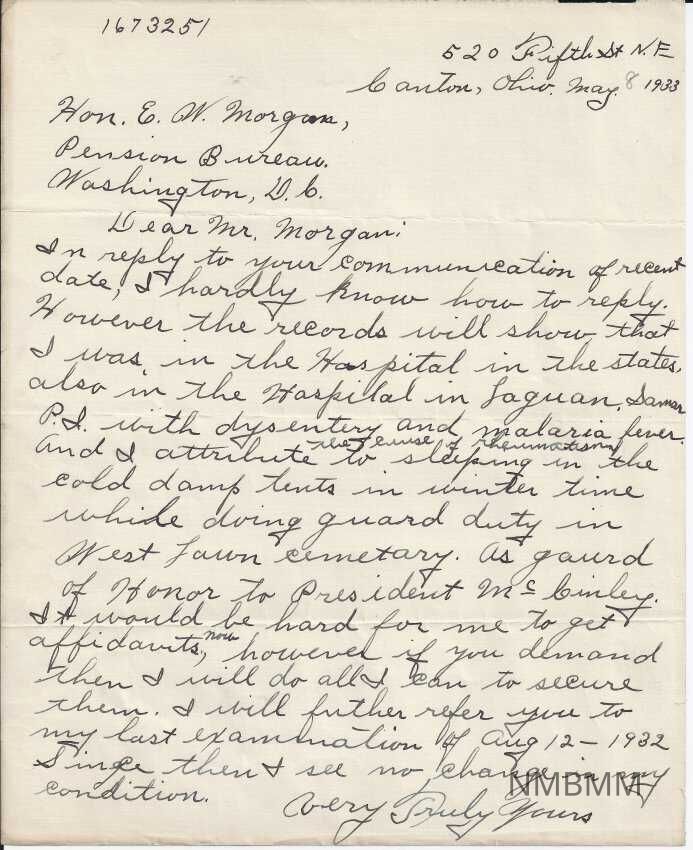 A letter sent from Mr. Herbert F.Doney to Hon. E.W. Morgan. The letter was sent in reply to notification that Doney recieved explaining that his pension was to be cancelled if he did not present affidavits. Doney was honor guard to the deceased William McKinley. He claims to have been in the hospital with dysentery and malaria, and is writing to keep his pension.Collection