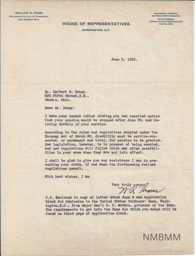 The item is a letter from Rep. W.R. Thom to Herbert F. Doney (the middle initial is printed as B.) regarding Doney's pension case and the information on the Soldiers' Home he requested. Thom assures him that he will help him out when forthcoming revised regulations permit, and he included an application for the United States Soldiers' Home.Collection