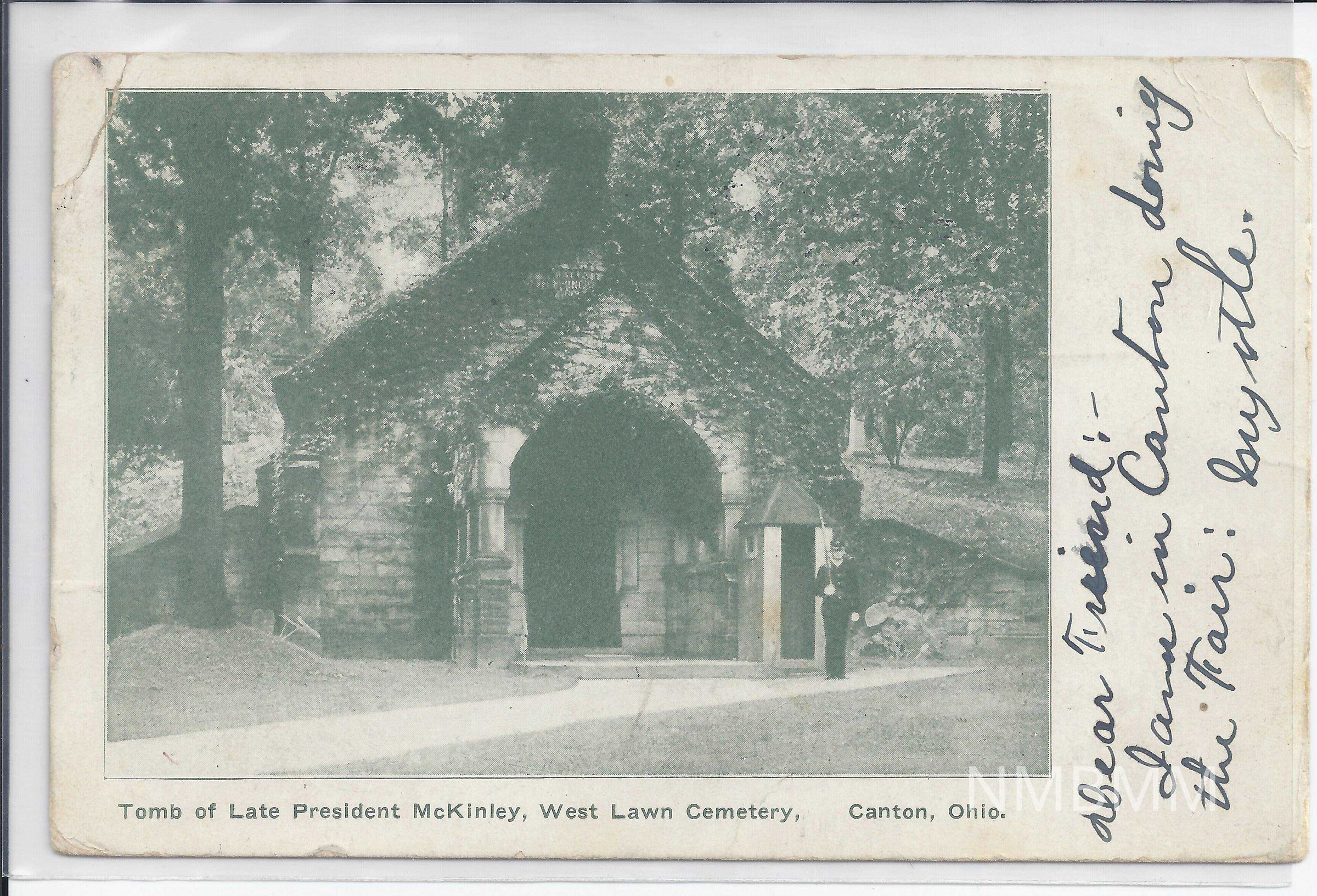 The item is postcard from Canton, Ohio sent to [Mrs. Wilmer Allison] of East Liverpool, Ohio. On the front there is a picture of William McKinley's tomb at West Lawn Cemetery. There is also a note that says [Dear Friend, I was in Canton during the Fair, Myrtle]