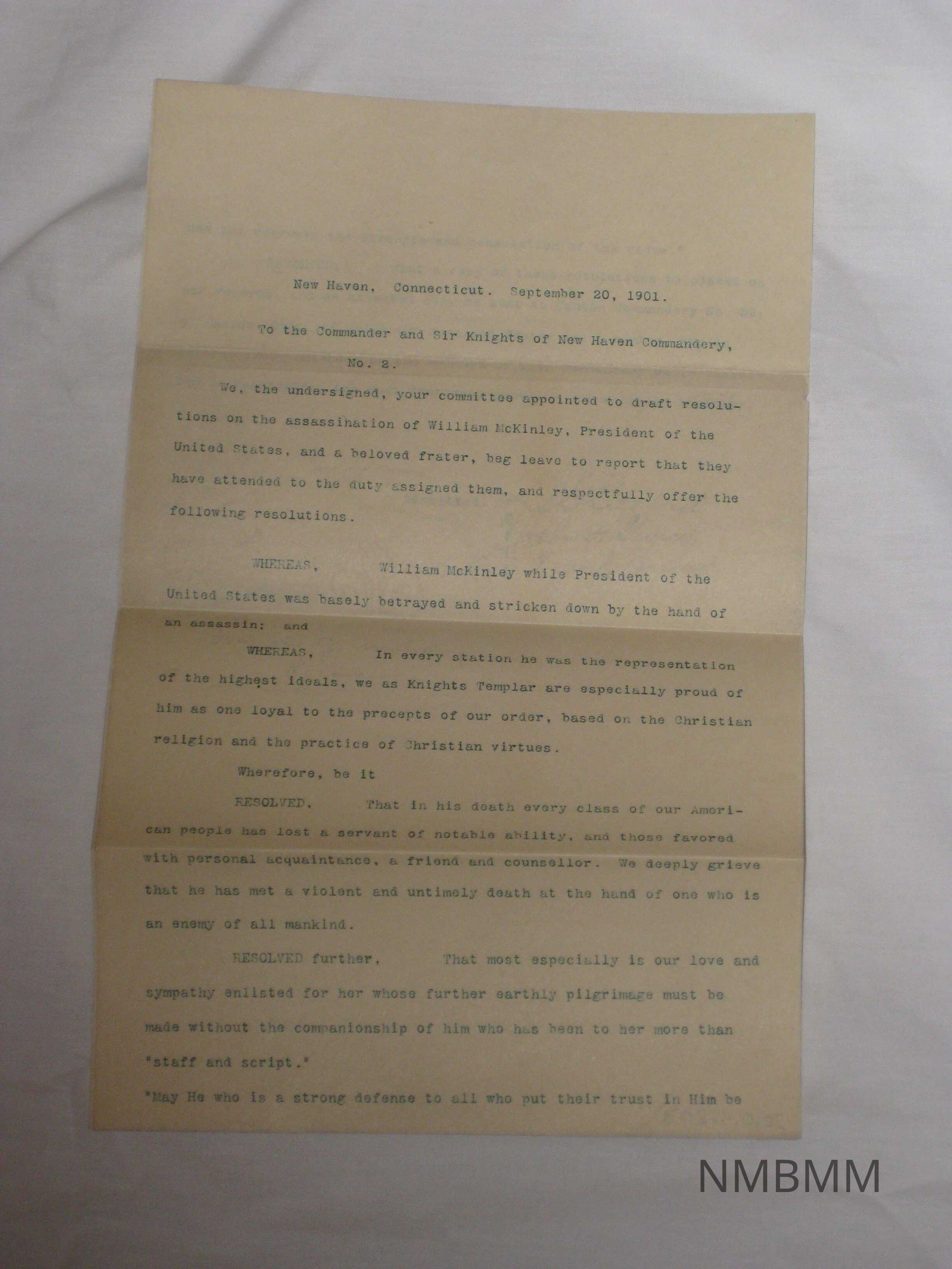 The item is a letter of resolutions from the Committee of the Knight's Templar New Haven Commandery No. 2 to its knights and commander. The resoultions adress the assassination and betrayl. They also express love and sympathy for Ida McKinley. Instructions for the resolutions to be passed to the Canton Commandery No. 38 are included.Collection