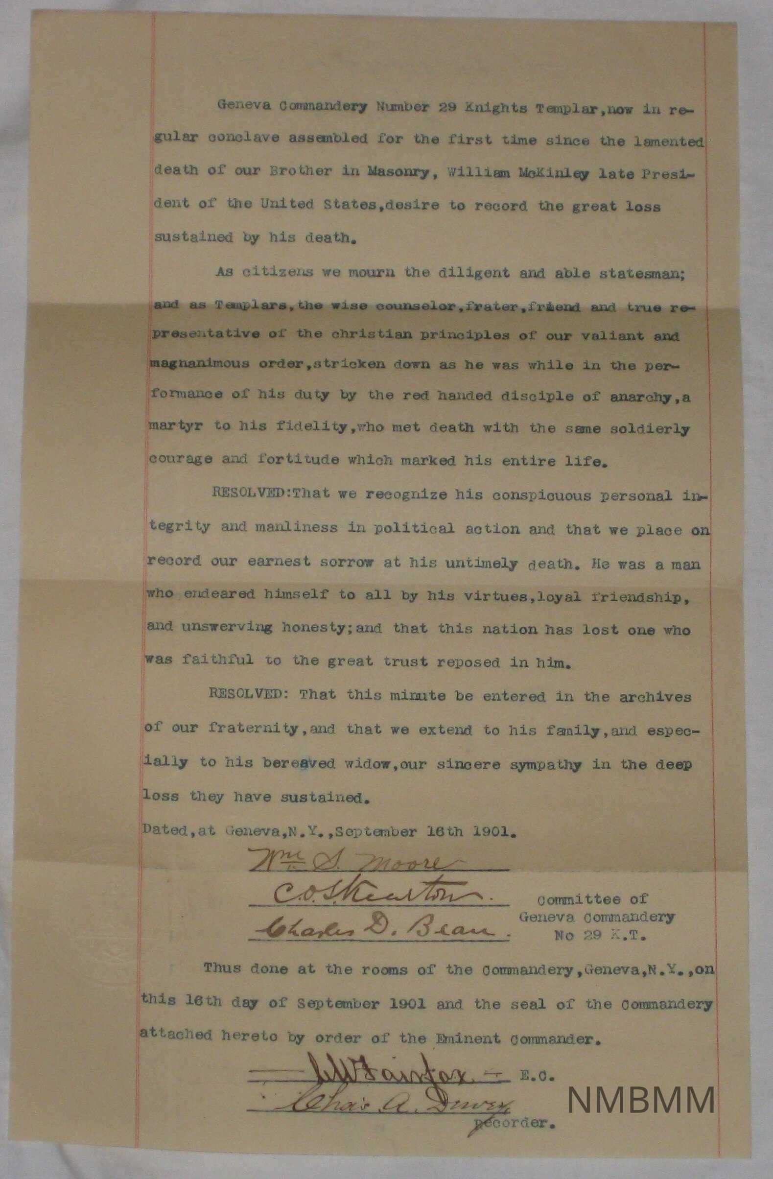 A resolution record passed by the Geneva Commandery No. 29 of the Knight's Templar. The resolution is about William McKinley's death. They expressing mourning and praise his both his personality and ability as a statesman. They also express sympathy for Mrs. McKinley. It is signed by the committee, the commander and the recorder of the Geneva Commandery.
