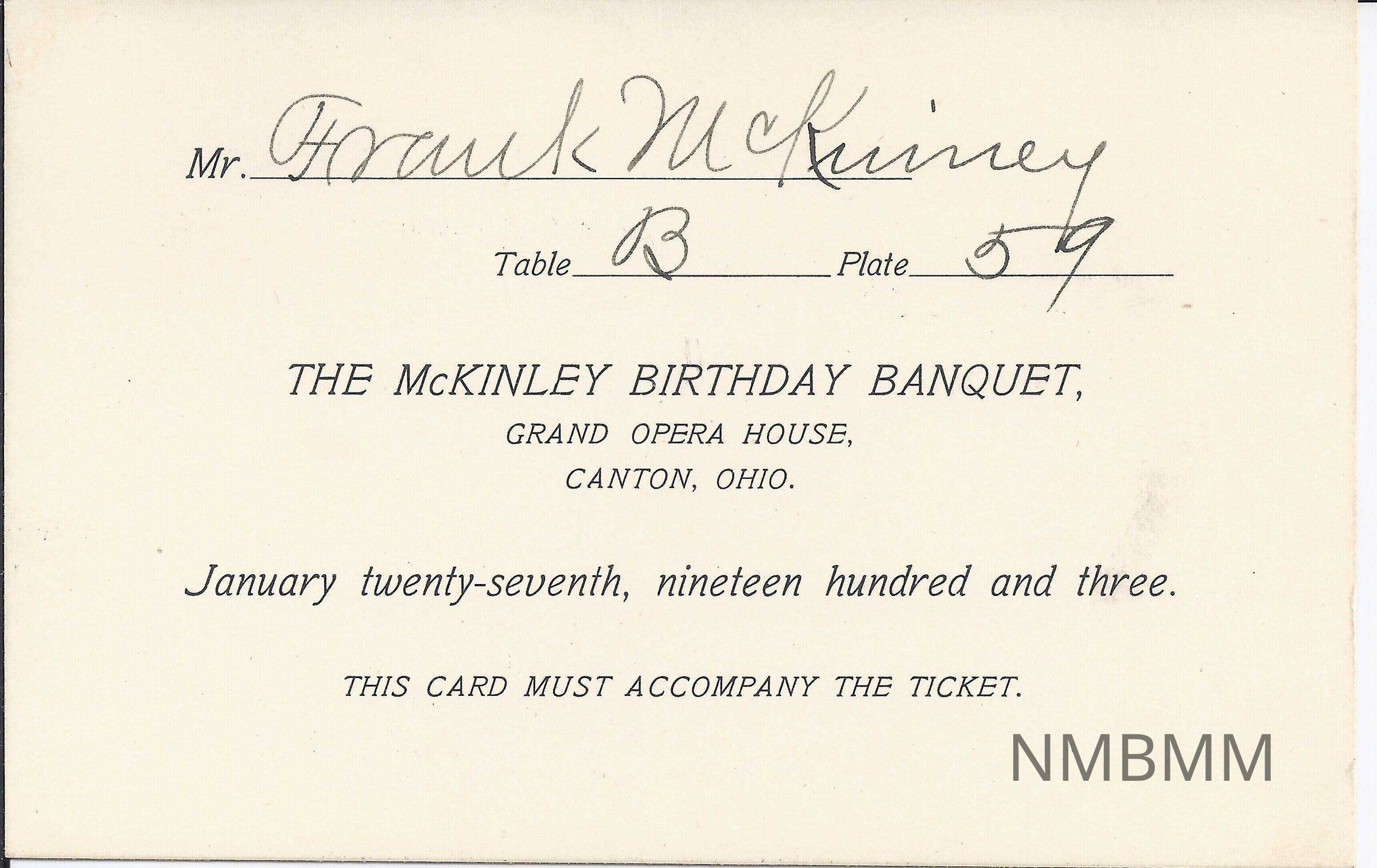 A card for the William McKinley Birthday Banquet with the mispelling of Frank M. Kinney's name as Frank [McKniney] at the top. The card is also designated to Table B Plate 59.Collection