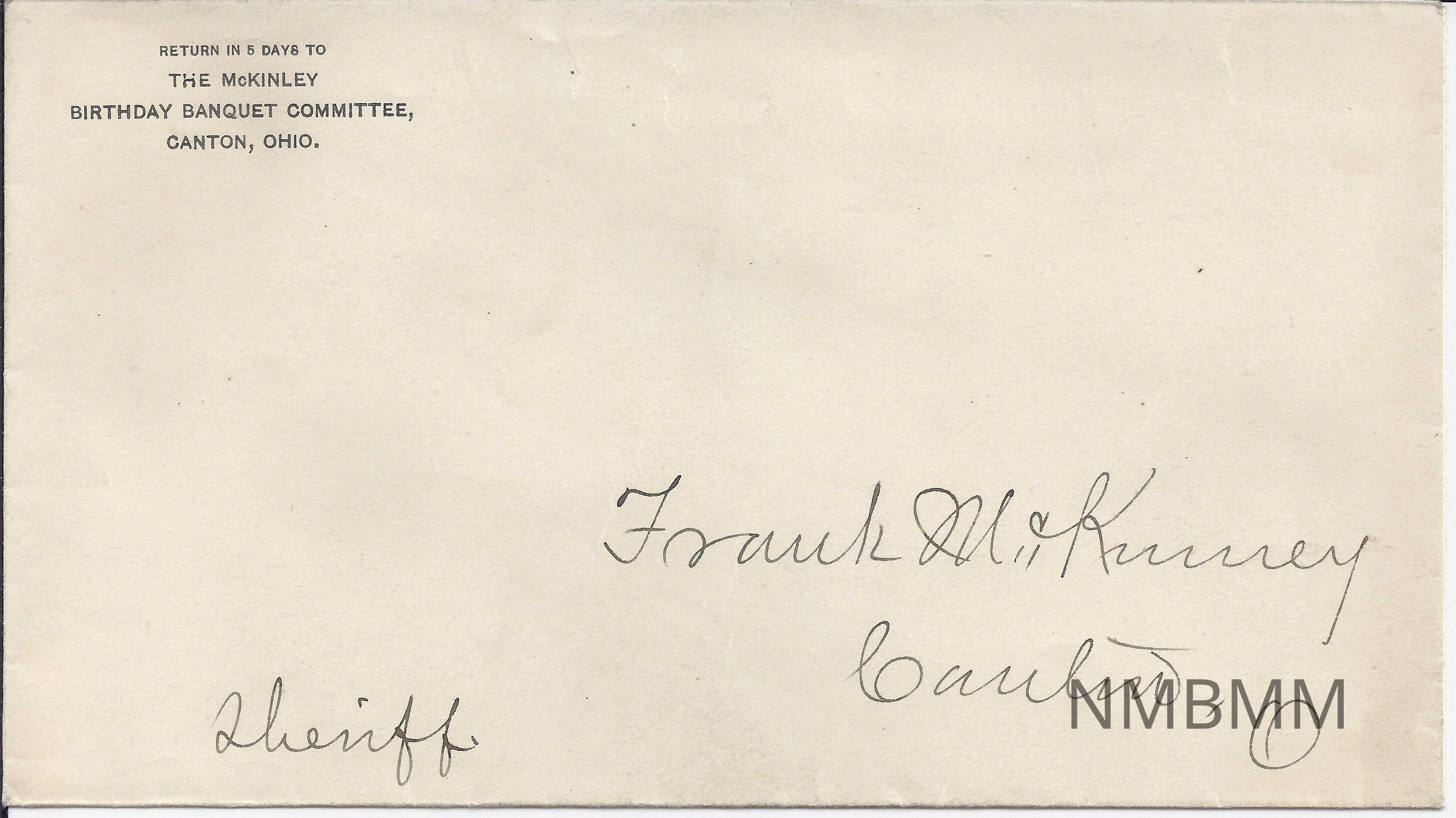 The item is an envelope adressed to Frank M. Kinney in Canton Ohio. Sheriff is also written on the front of the envelope. The item is from the McKinley Birthday Banquet Committee.Collection