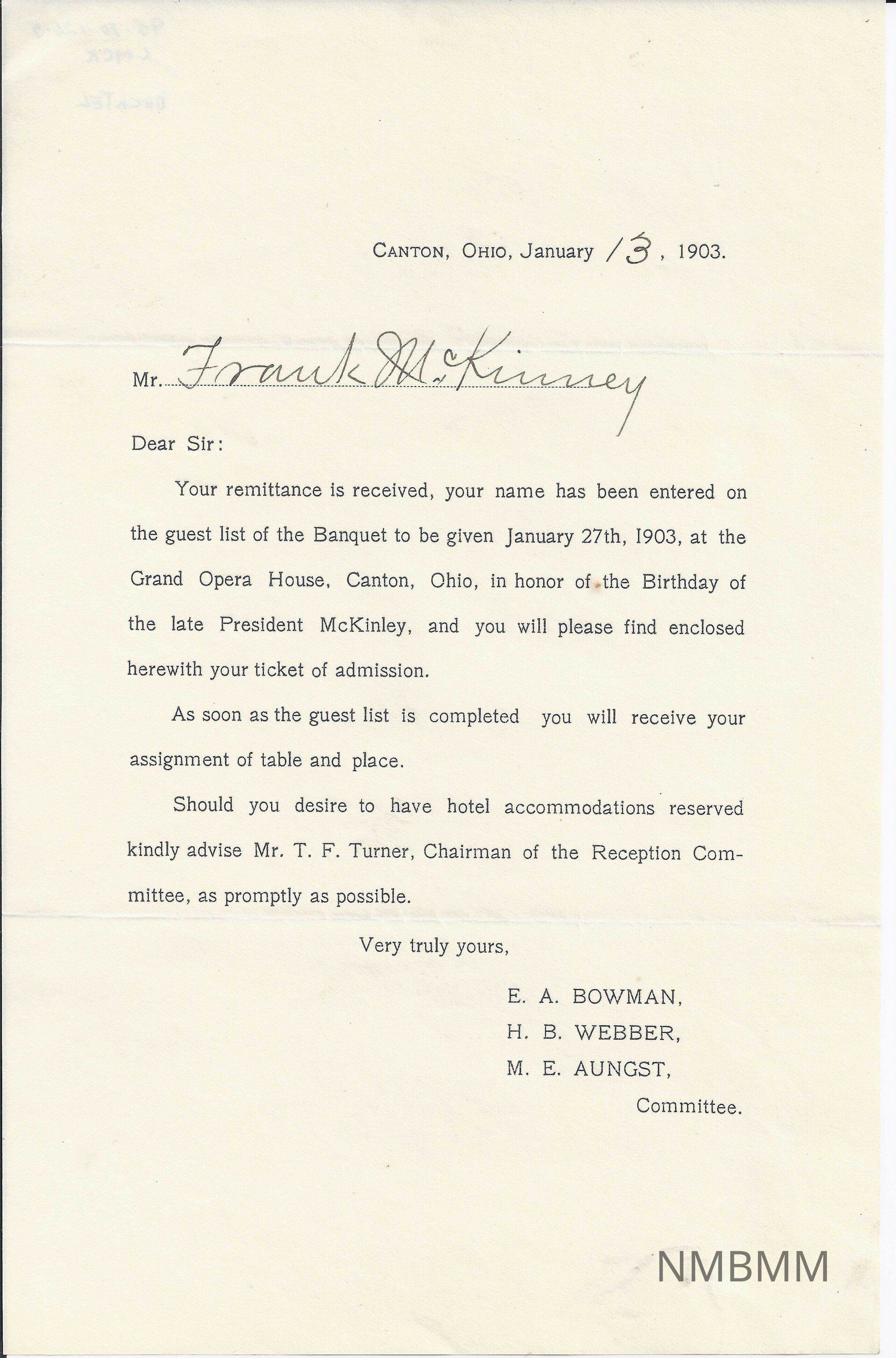 The item is a letter from the committee of the William McKinley Birthday Banquet. The letter is adressed to Frank M. Kinney stating that his remittance was recieved and he will now be added to the guest list.