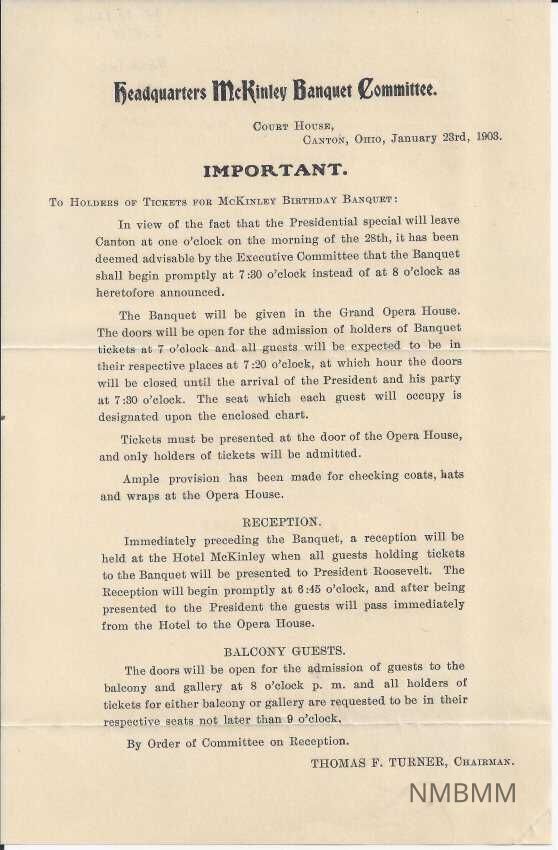 The item is an announcement sent to the holders of tickets for the McKinley Birthday Banquet, from the McKinley Banquet Committee. The announcement informs them that the Banquet will began at 7:30 PM instead of 8 P.M. It also informs them they must be in their seats by 7:20 and has information on the reception and for balcony guests.Collection